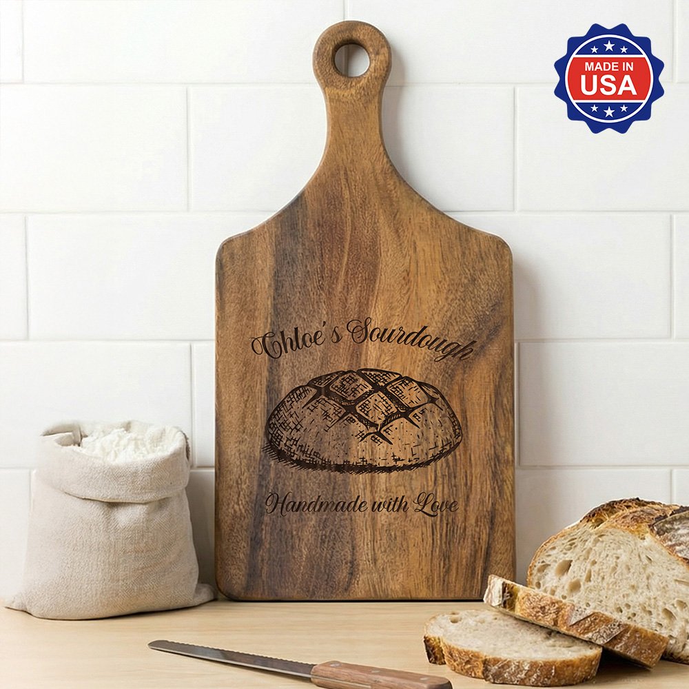Inspired by the craft and culture of sourdough baking, this board supports name customization. Featuring a classic paddle shape with a comfortable handle and a hanging loop for easy storage, this personalized design makes the cutting board both practical and distinctive.
