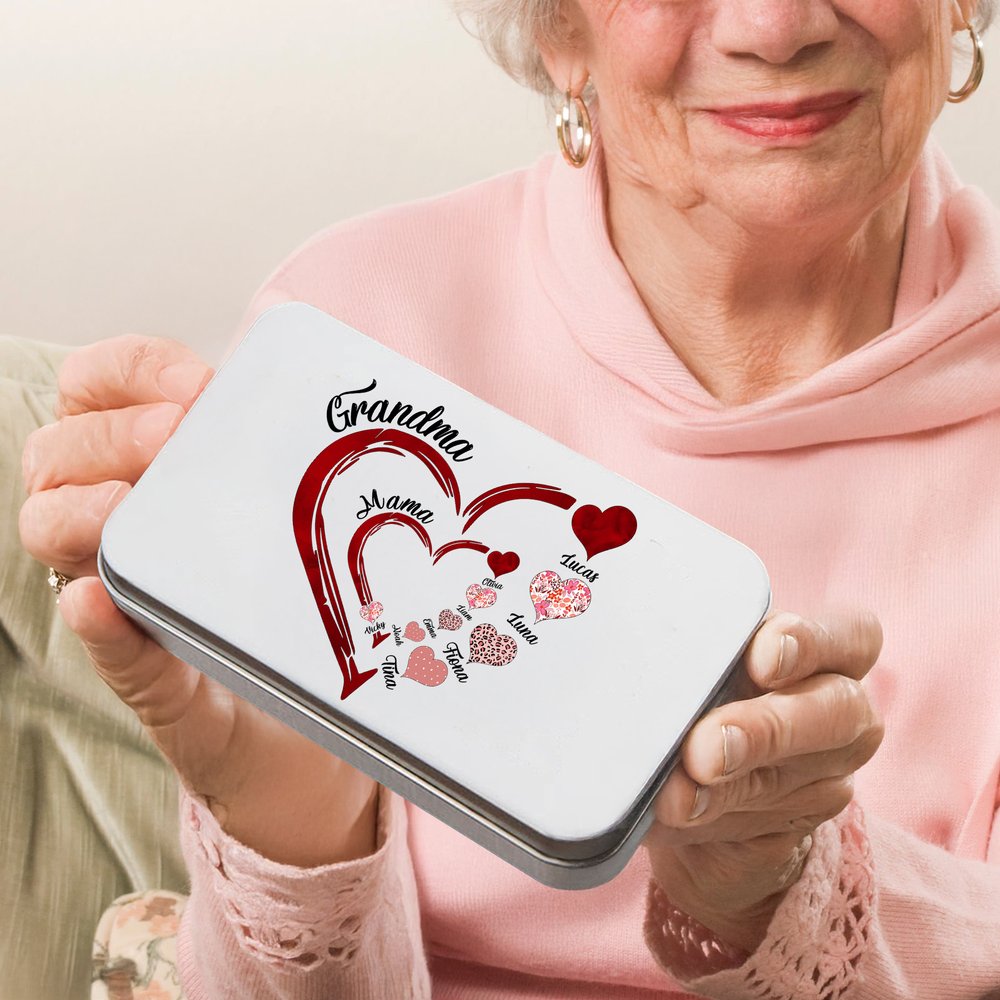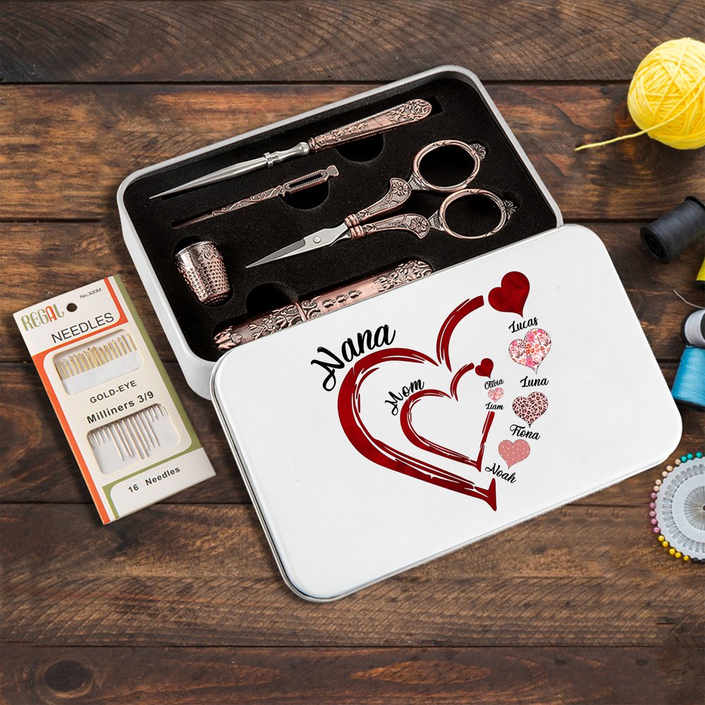 Personalized Family Heart Design Tin Box and 6 Pcs Sewing Tools Set with Kid Names Christmas Birthday Gift for Tailor Sewing Lover