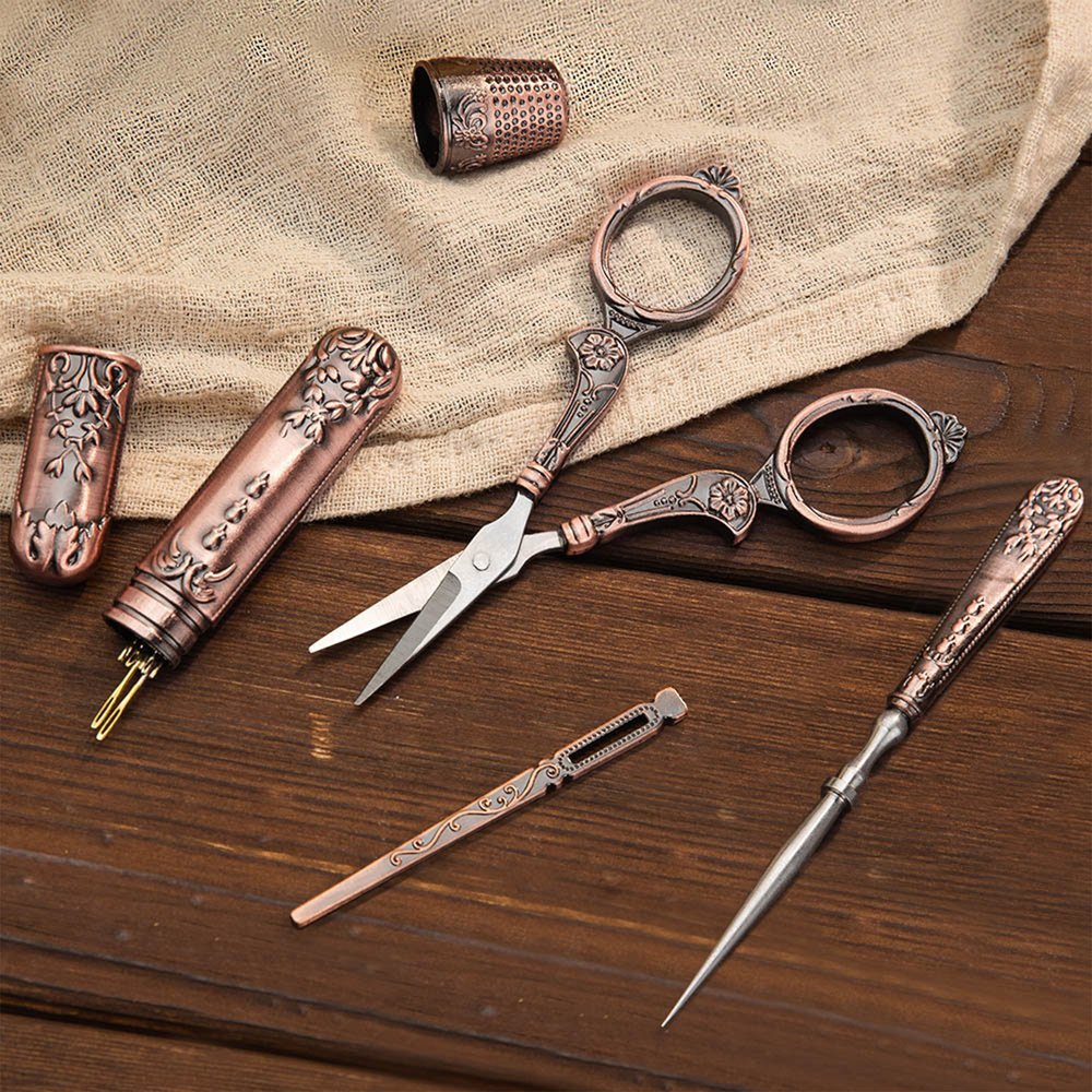 Measurement: Tin Box - 5.9" Γ— 3.54" Γ— 1.18"(15cm Γ— 9cm Γ— 3cm) Scissors - 4.33"(11cm) Needle Threader - 2.75"(7cm) Needle Box - 3.42"(8.7cm) Thimble - 0.7"(1.8cm) Awl - 4.72"(12cm)