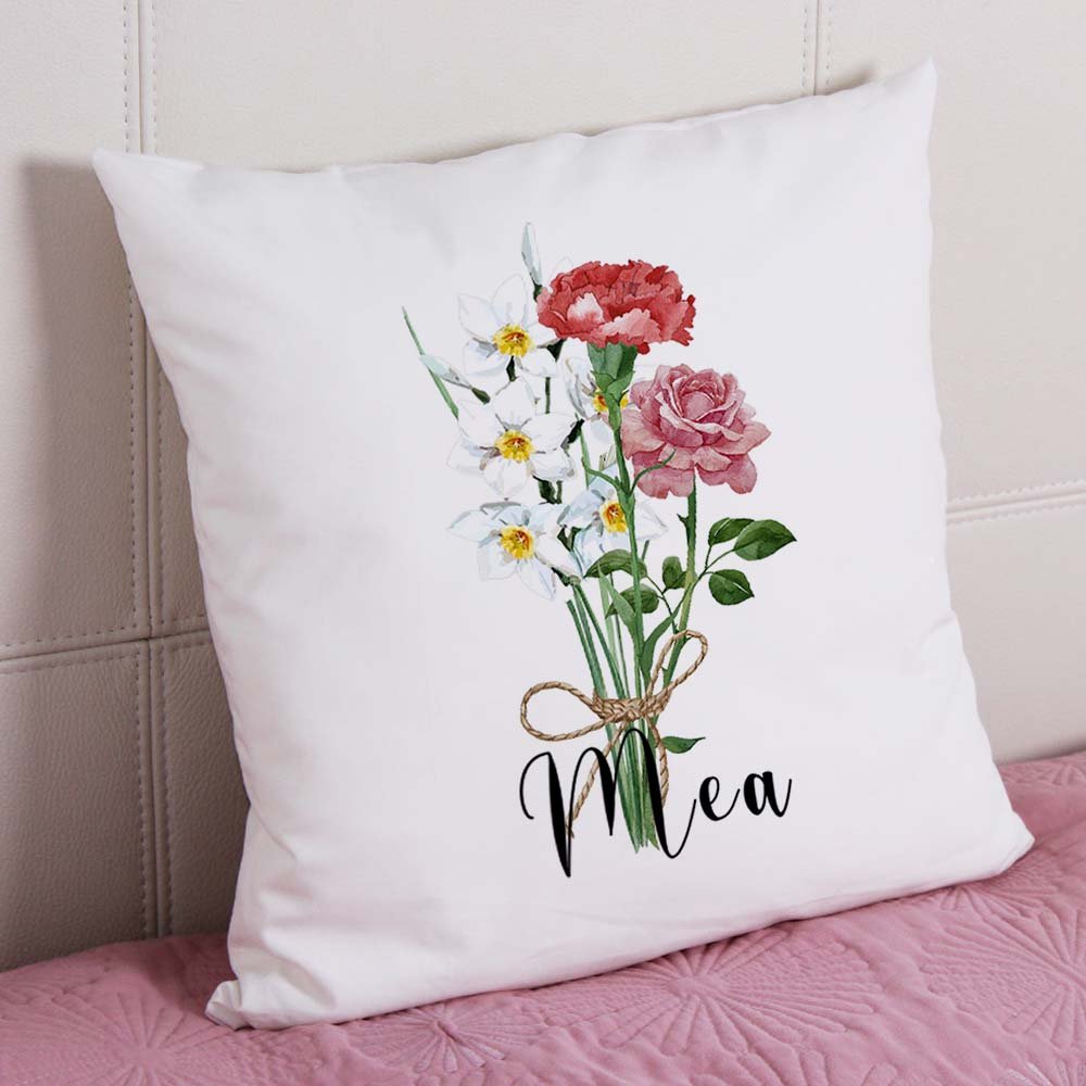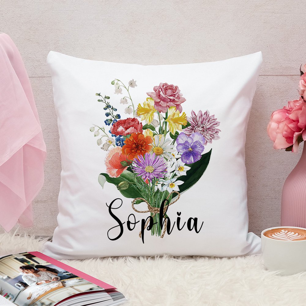 Personalized Watercolor Birth Flower Bouquet Pillow Cover Family Theme Home Decoration Mother's Day Birthday Gift for Mom Grandma