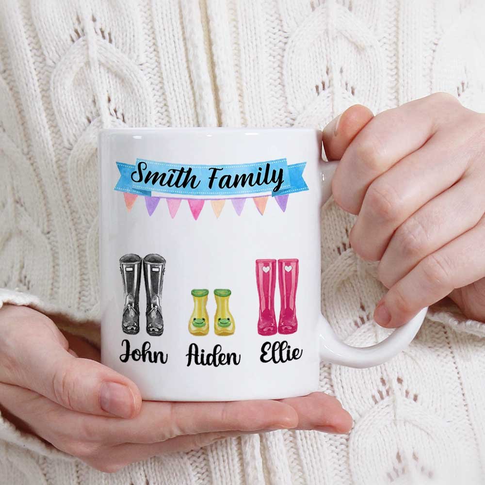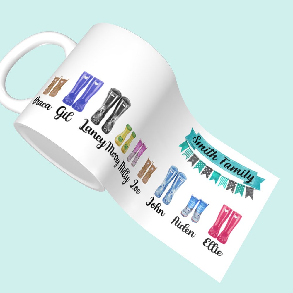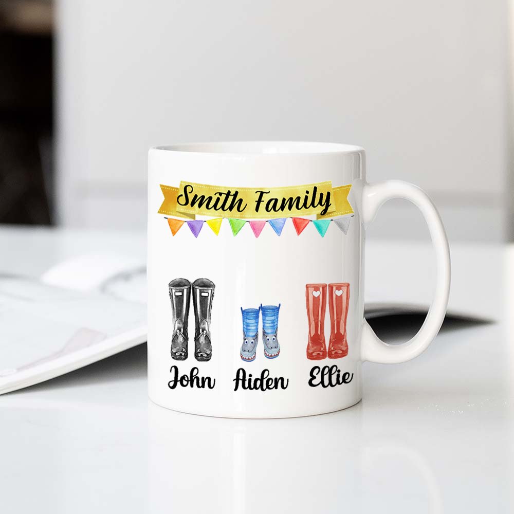 The name of the family can be customized on the mug, combined with the elements of streamers, rain boots, and flags. The overall design is lively and cute, symbolizing the harmony of family feelings and unity. There are also a variety of flags, rain boots, and ribbon colors to choose from.