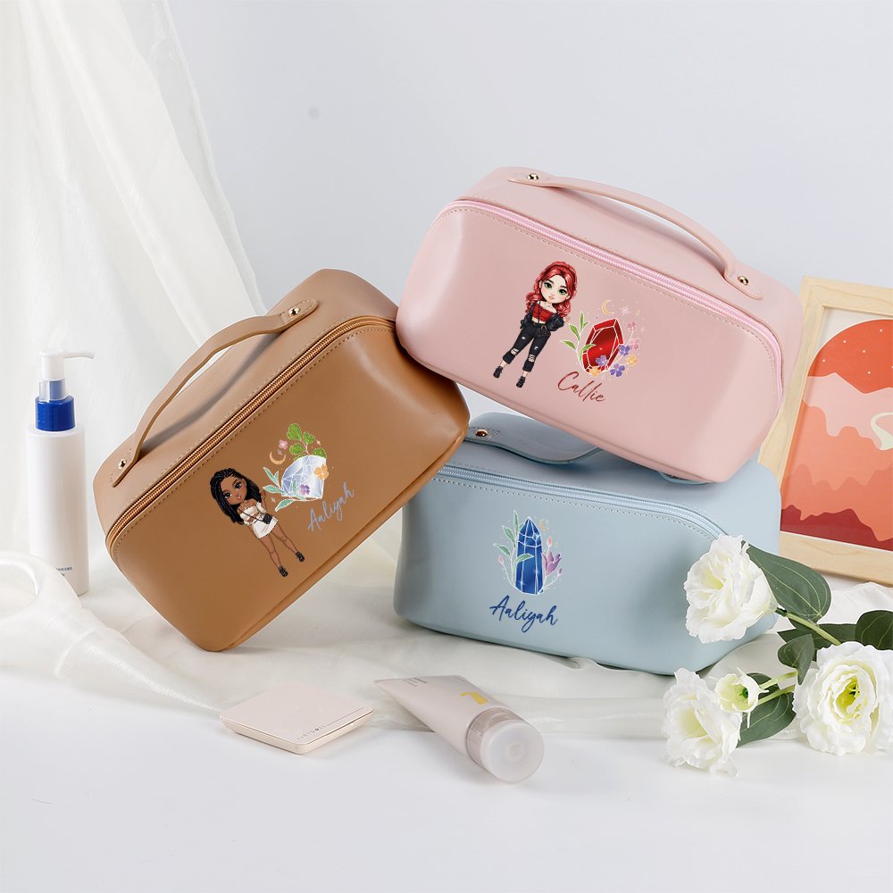 This makeup bag uses fashion girls as its core design element. From the passionate red-haired girl to the shining blonde girl to the charming black-skinned girl, each image vividly shows a diverse fashion style. Your name can be printed on the makeup bag to make the product exclusive. In addition, it is printed with birthstone patterns such as red, blue, and green gemstones, surrounded by moons, stars, and colorful flowers, adding a mysterious and romantic atmosphere.