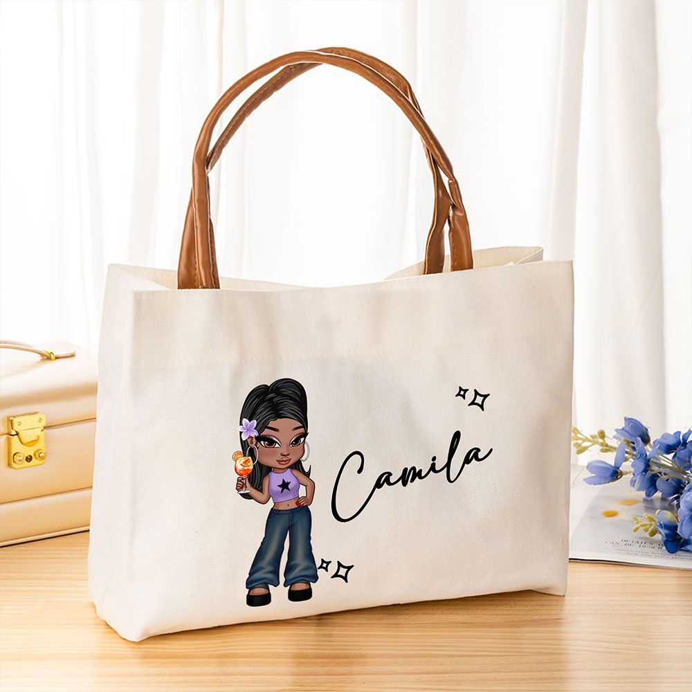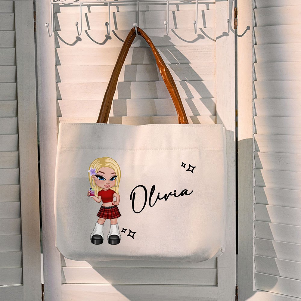 Features a stylish Y2K-inspired fashion girl illustration and personalized name customization. The retro-modern aesthetic captures the popular Y2K trend while providing a unique, personalized accessory that stands out.