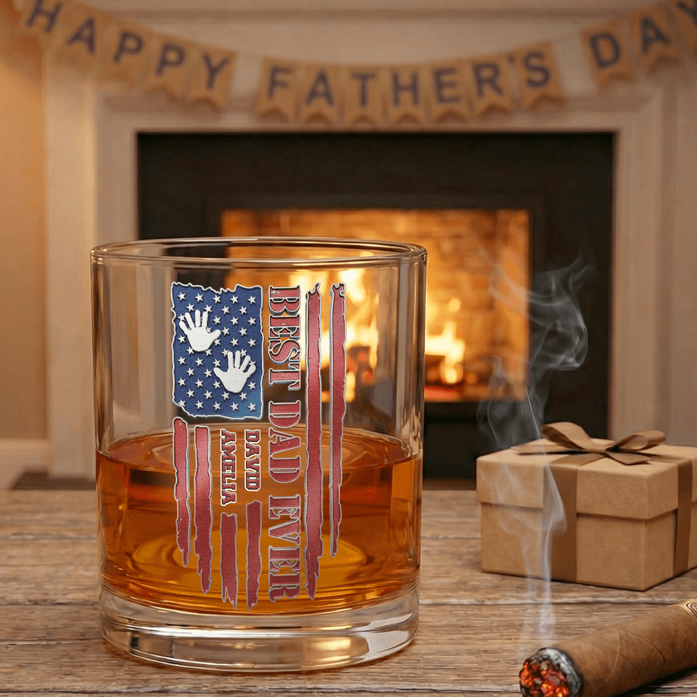 This 10‑ounce whiskey glass showcases a classic flag motif in crisp blue and red with layered detailing and a charming handprint accent. The result is a refined vintage look with a playful twist. The flag design is seamlessly paired with a custom name, creating a distinctive, personalized piece that stands out whether on the bar or on display.