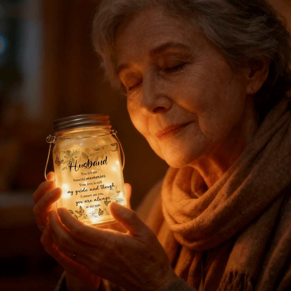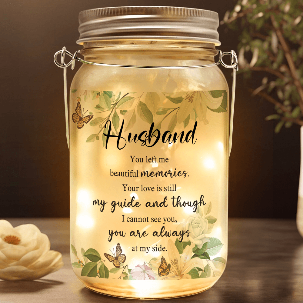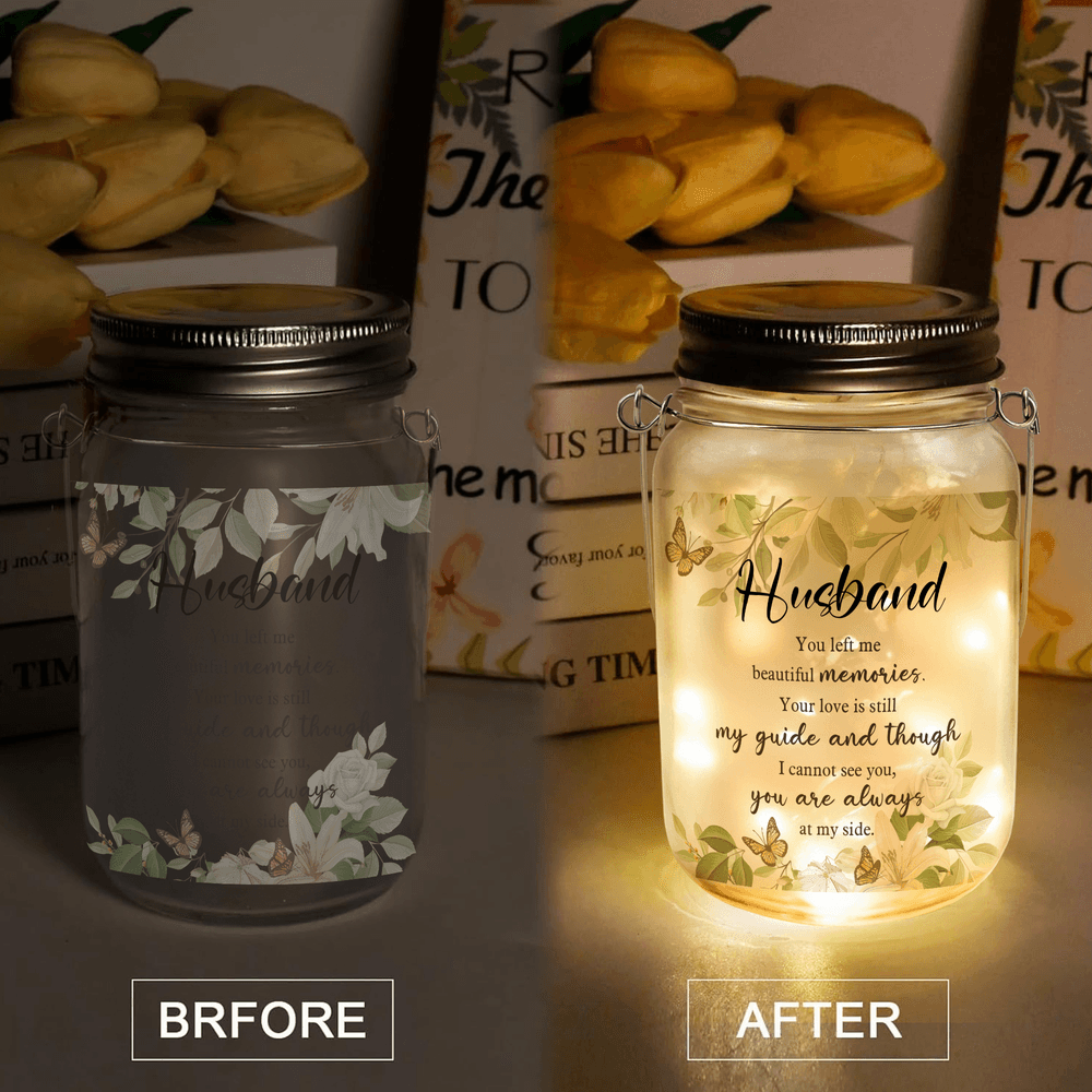 This heartfelt Mason Jar Light features a delicate floral and butterfly design with soft greenery and roses, paired with a heartfelt message for a lost loved one. It offers full personalization: add a nickname and a text to create a one-of-a-kind tribute that honors your unique bond. The warm LED glow illuminates the text and design, turning it into a gentle, comforting reminder of love that lasts.