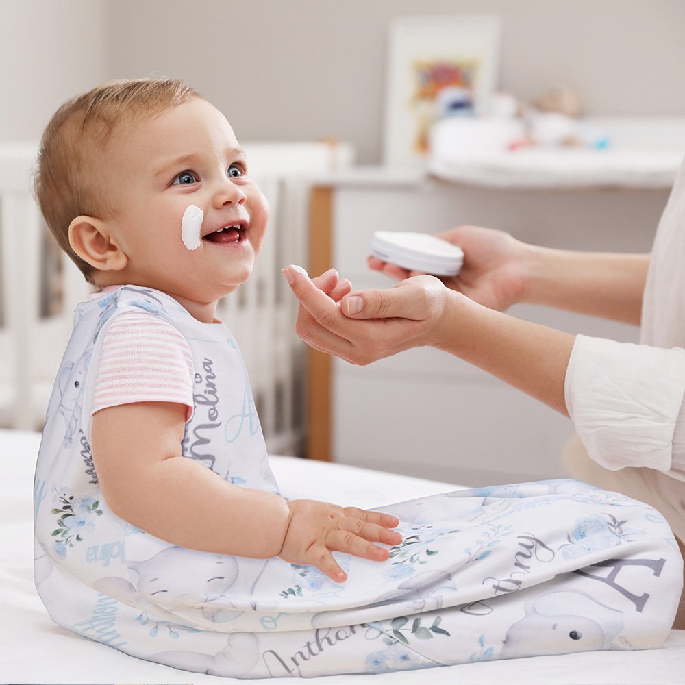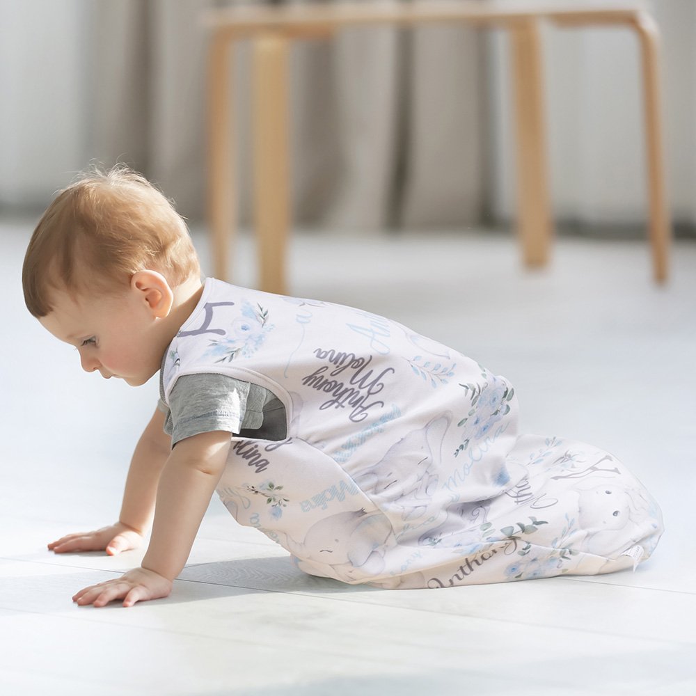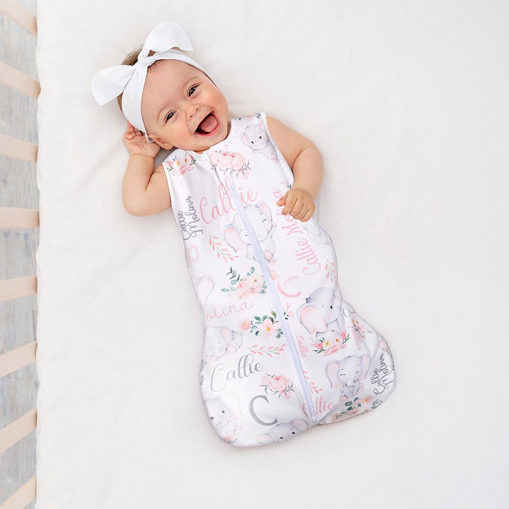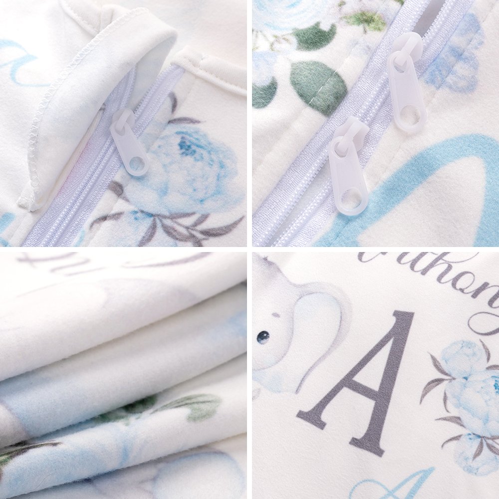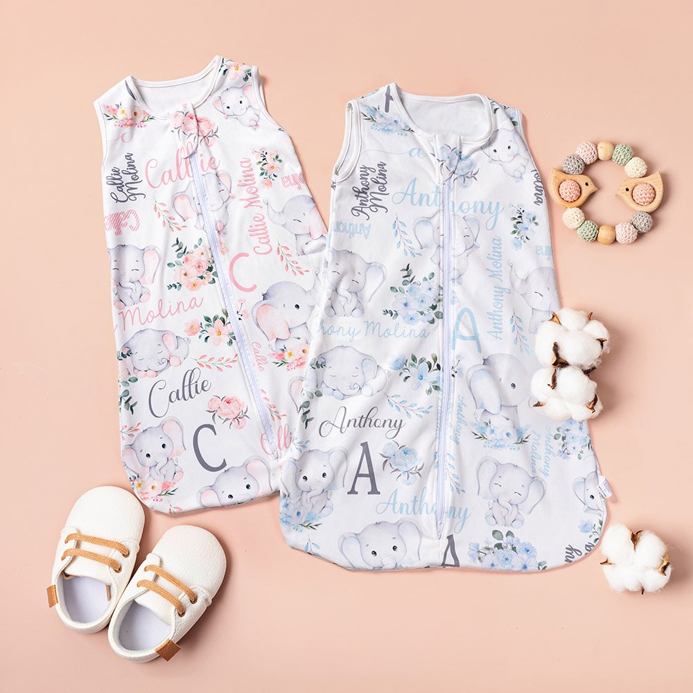 The baby sleep bag is distinguished by an adorable elephant design, beautifully coupled with vibrant floral patterns. Further charm is added with the baby's initial and name, creating a truly one-of-a-kind piece for your little one.