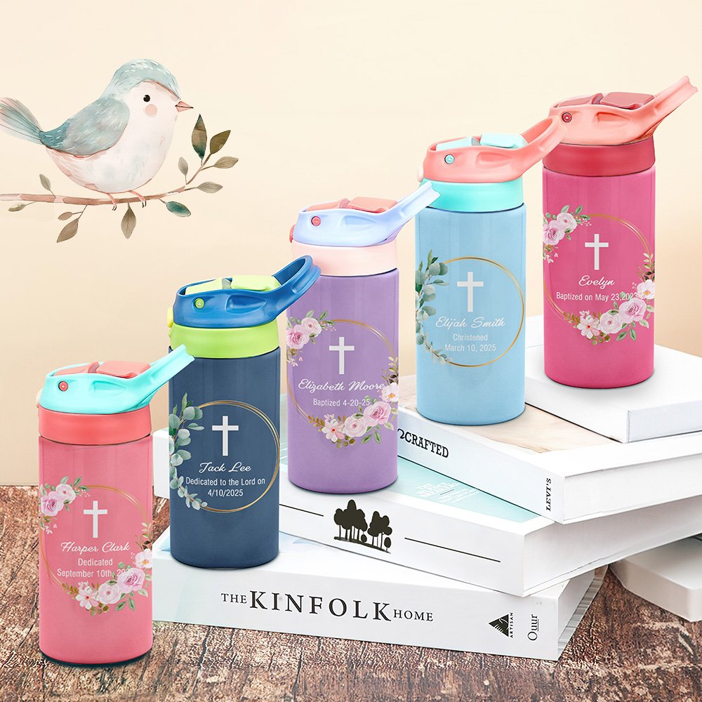Adorned with colorful flowers and a cross, our water bottle perfectly blends natural elements with religious symbols. The cross at the center adds a solemn and sacred atmosphere, surrounded by vivid flowers or green leaves, creating a simple and elegant beauty. Additionally, it can be personalized with your children’s names and a year to remind them of their faith at all times and inspire them.