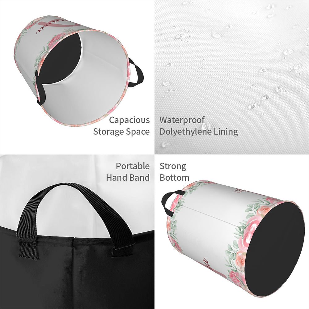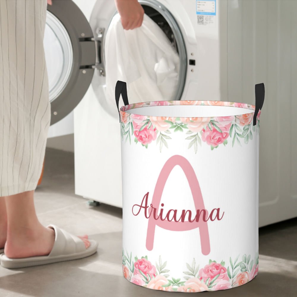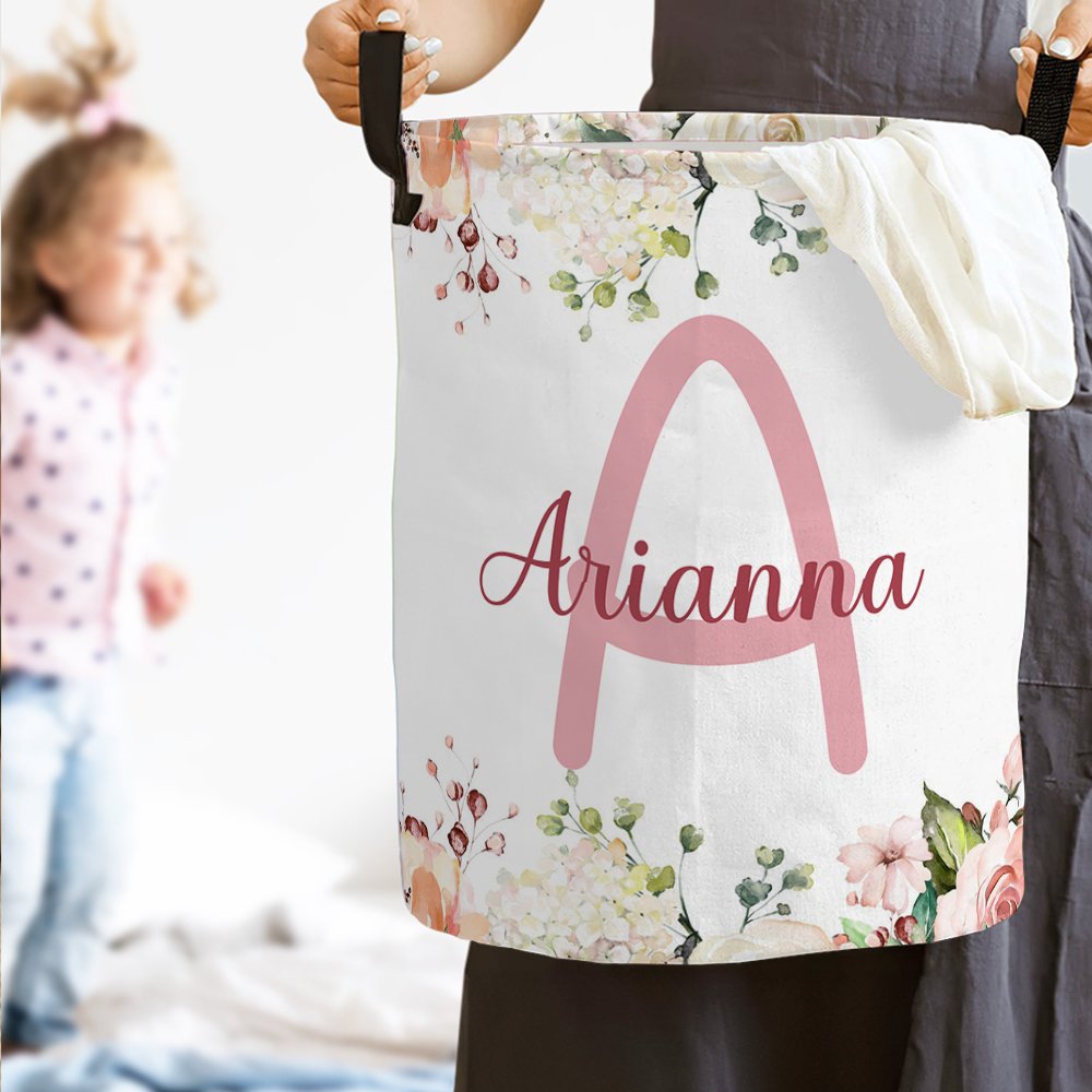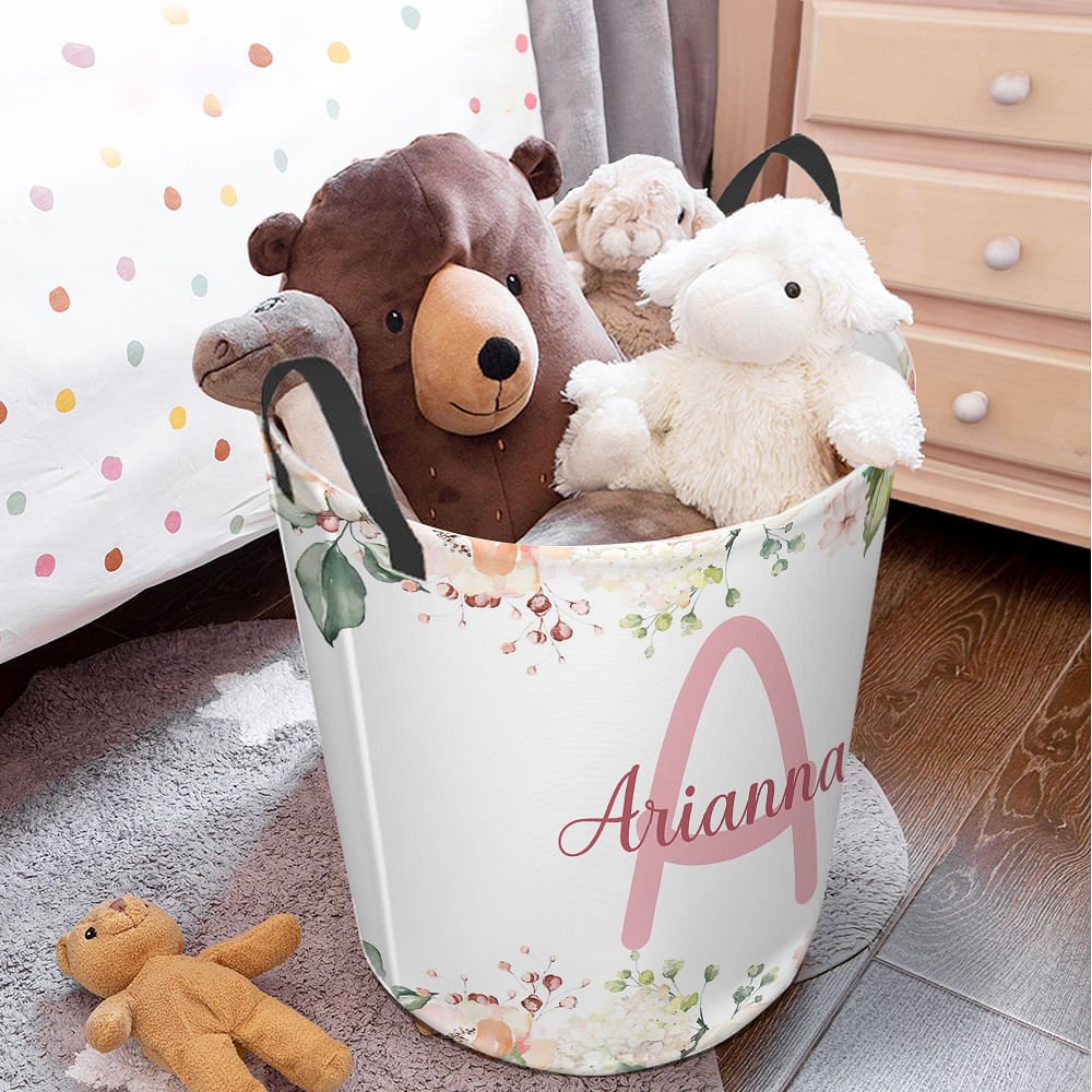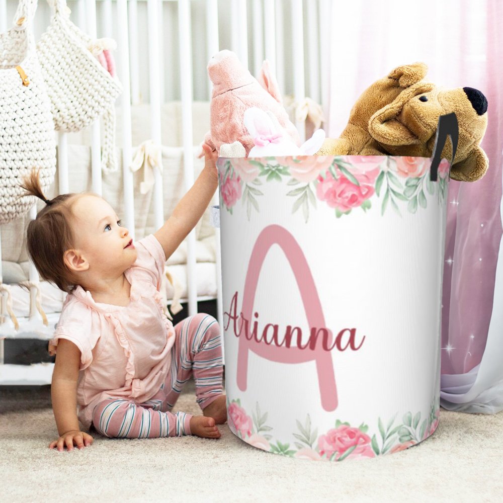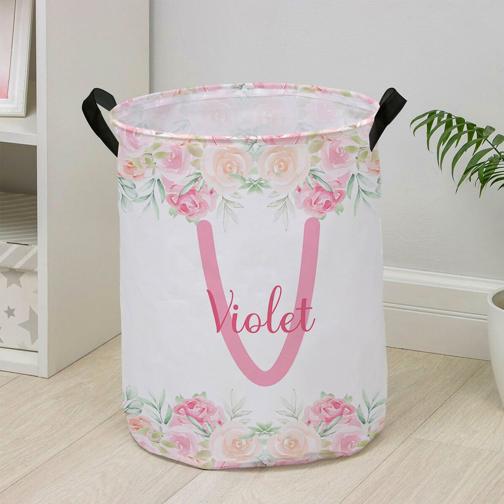 This large floral-themed toy storage laundry basket can be personalized with names and initials and comes in three styles to add character to a child's playroom or bedroom.