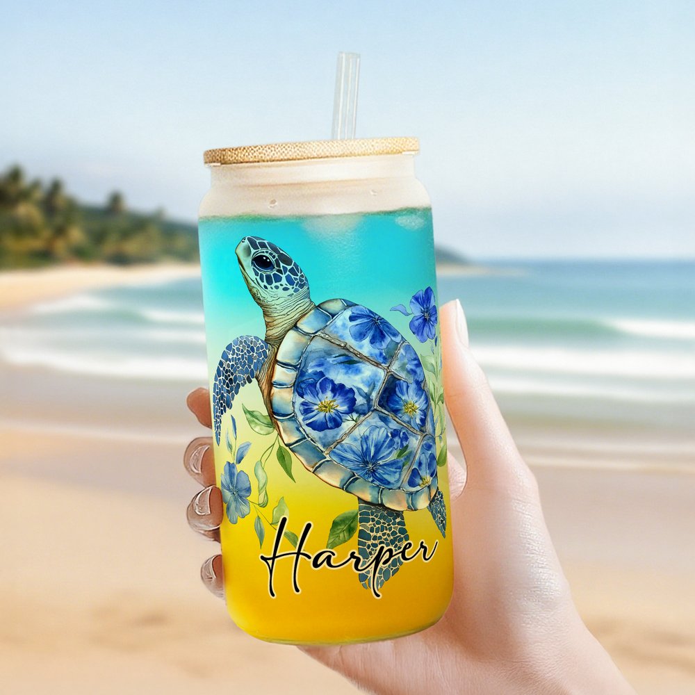 The glass tumbler features lively flowers and turtle patterns, integrating the healing feeling of the ocean into daily life. Lifelike turtles swim among the flowers, with exclusive customized names, giving each glass tumbler a unique sense of story. Whether it is for personal use or as a gift, it can convey the beautiful mood of nature and relaxation.