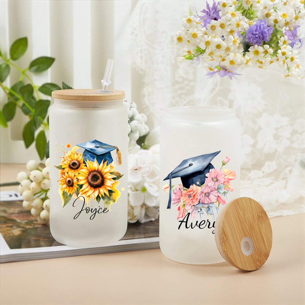 The glass can features a beautiful and symbolic flower graduation hat design, representing growth, beauty, and success. The vibrant colors and intricate details make it a visually appealing and meaningful gift for graduates. Personalize it with their name, celebrating their achievement and creating a lasting memento of their graduation.