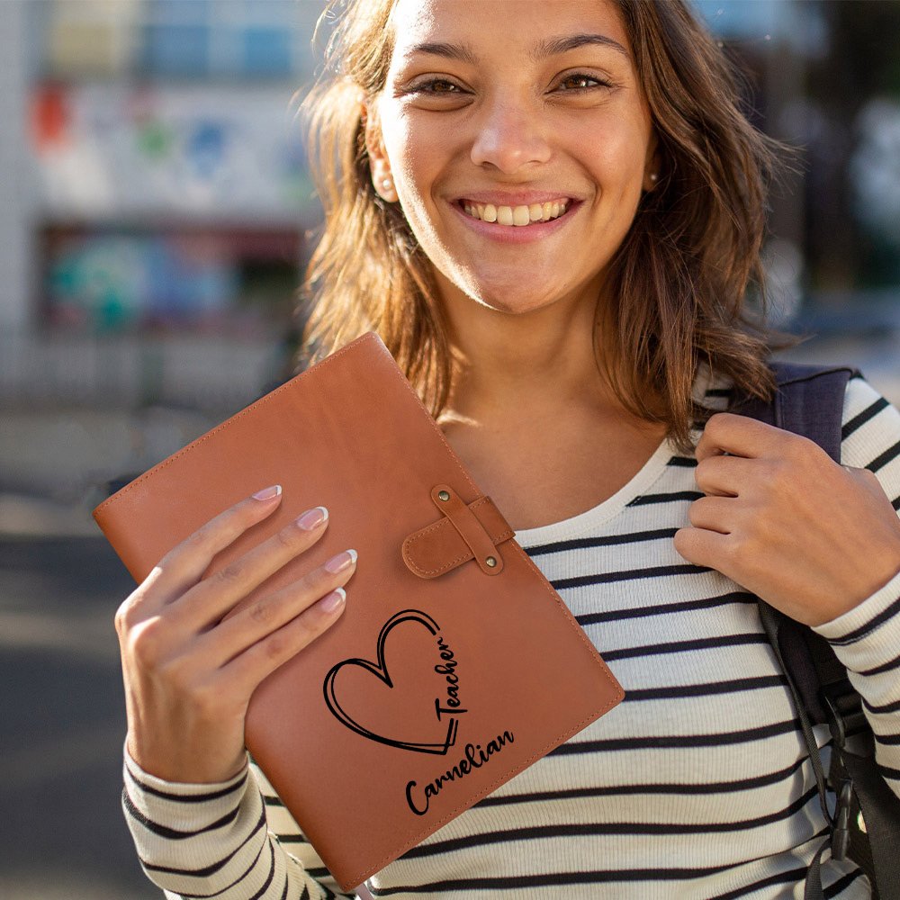 This personalized floral teacher leather notebook features a custom floral pattern, pencil, heart shape, teaching tools combined with laser engraving, resulting in a vintage and elegant appearance. The cover can be customized with a name, making it even more unique.