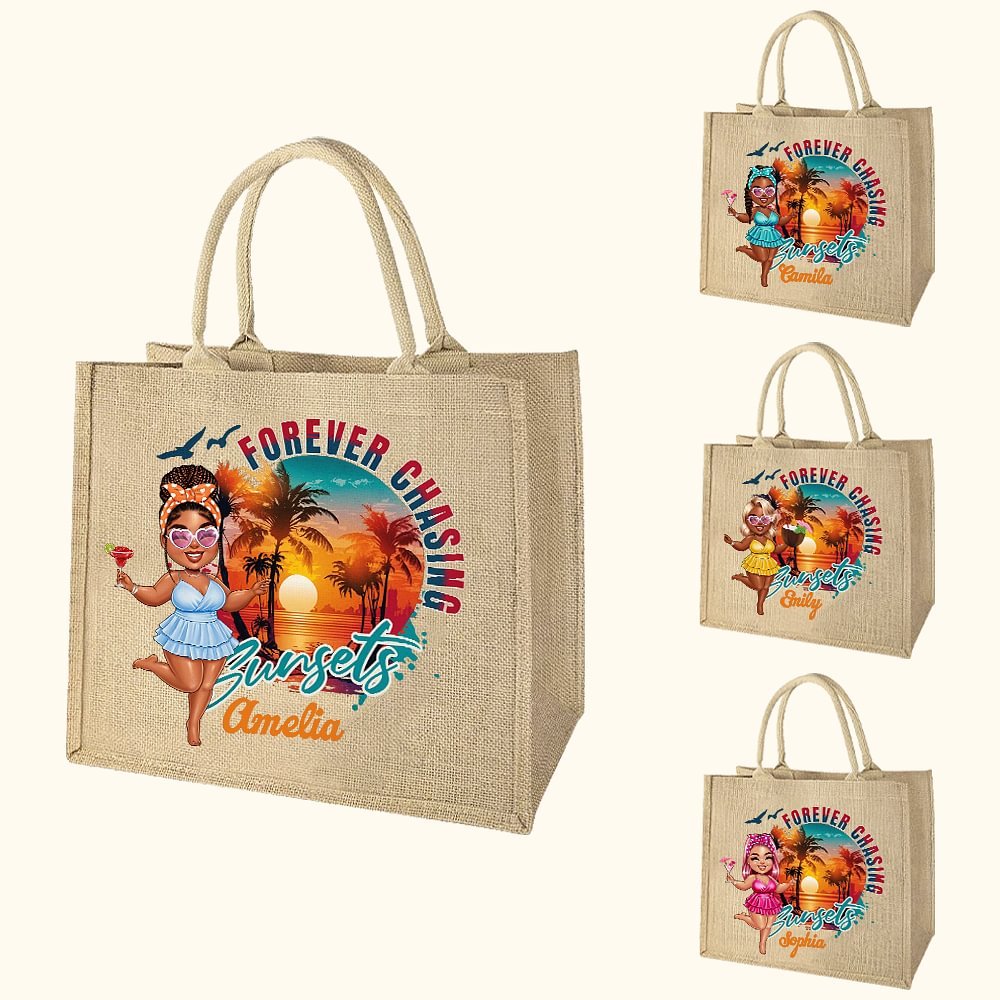 This tote bag features an adorable cartoon Black woman with three different skin tones and hairstyles, capturing the diversity and beauty of African American women. The sunset beach background adds a serene, carefree vibe, making each bag uniquely personalized with the recipient's name.