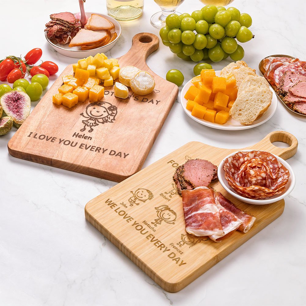 The top of this cutting board is engraved with the title ”FORGET MOTHER’S DAY, I LOVE YOU EVERY DAY”. In the center, there are various designs of children or animals, and you can choose from 1 to 8 kids based on your needs. Below the design, there is a heartfelt message for mothers, allowing you to select either "I LOVE YOU EVERY DAY" or "WE LOVE YOU EVERY DAY" depending on the number of children you choose, expressing your love for your mom.