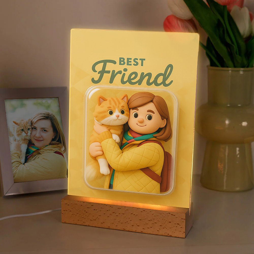 This custom acrylic luminous LED light ornament will open up a wonderful encounter between light and art for you. Just upload your favorite photos and enter your exclusive name or blessing. The designer will transform the technology into a cartoon-style flat printing 3D effect full of childlike fun, so that the static picture will jump out in the light and shadow.