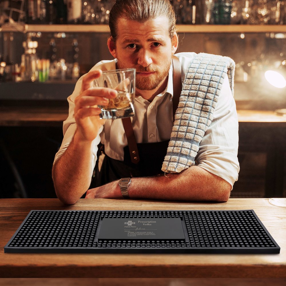 Personalize your bar mat with the recipient's name, the type of prescription, alcohol name for a unique and humorous touch. This engraving customization and funny design add a unique flair, making it a perfect accessory for home bars, pubs, or restaurants.