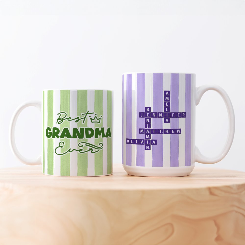 Personalized Funny Scrabble Names Crossword Puzzle Striped 11/15 oz Ceramic Mug with Title Daily Use Mother's Day Gift for Mom Grandma