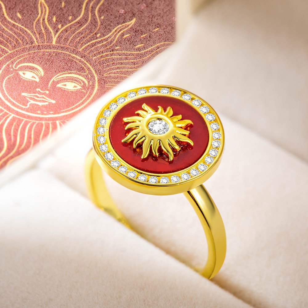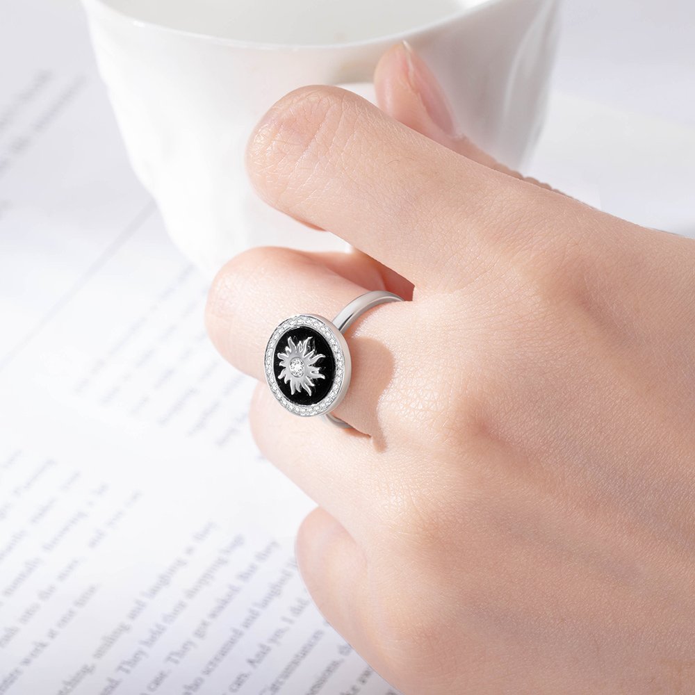 These spinner rings are inspired by two positive energy sources. The sun is associated with the positive attributes of birth, harvest, prestige, and healing, and solar energy boosts your mood and keeps you calm and focused. The gemstone underneath the sun, which come in three options (black agate, red agate, and blue sandstone), brings a different energy to the wearer. The contained energy varies with the type of stone you choose, and they are all beneficial to keep the wearer in good status.