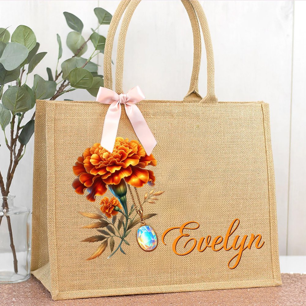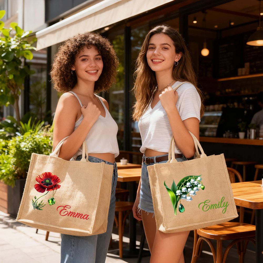 This tote bag features a customizable design—choose your unique birth flower paired with a matching gem accent, plus a personalized name in elegant typography. The natural burlap base blends with the vibrant floral prints, turning a basic tote into a stylish, meaningful accessory that reflects your identity.