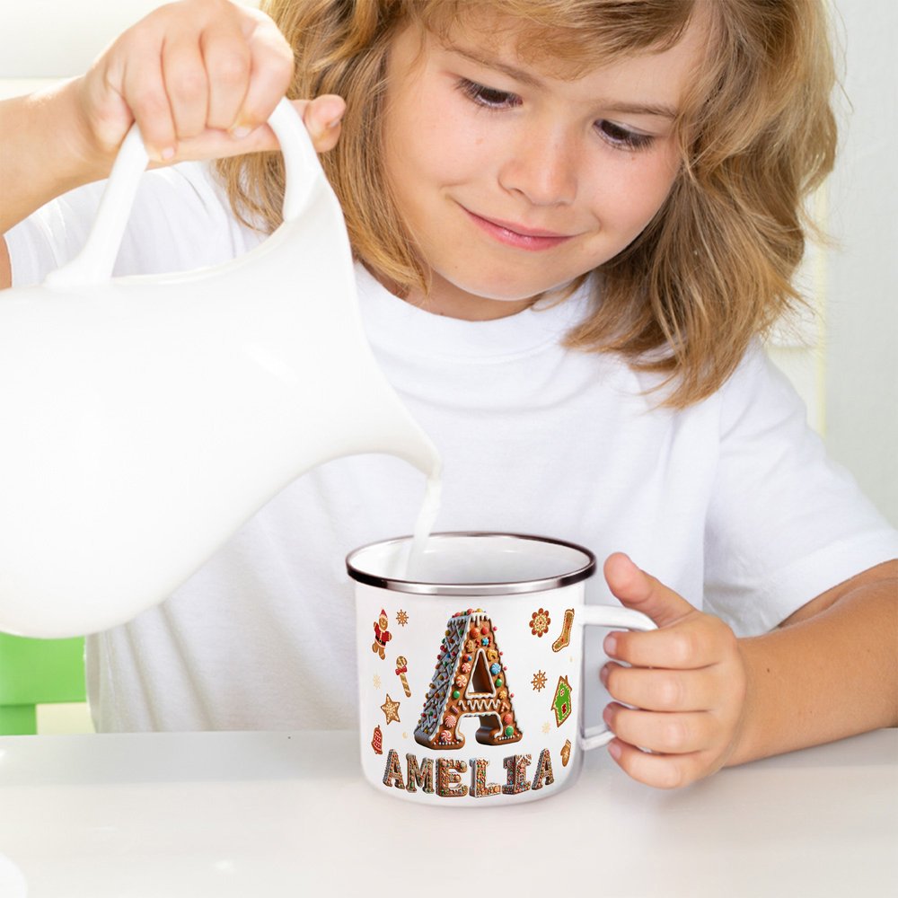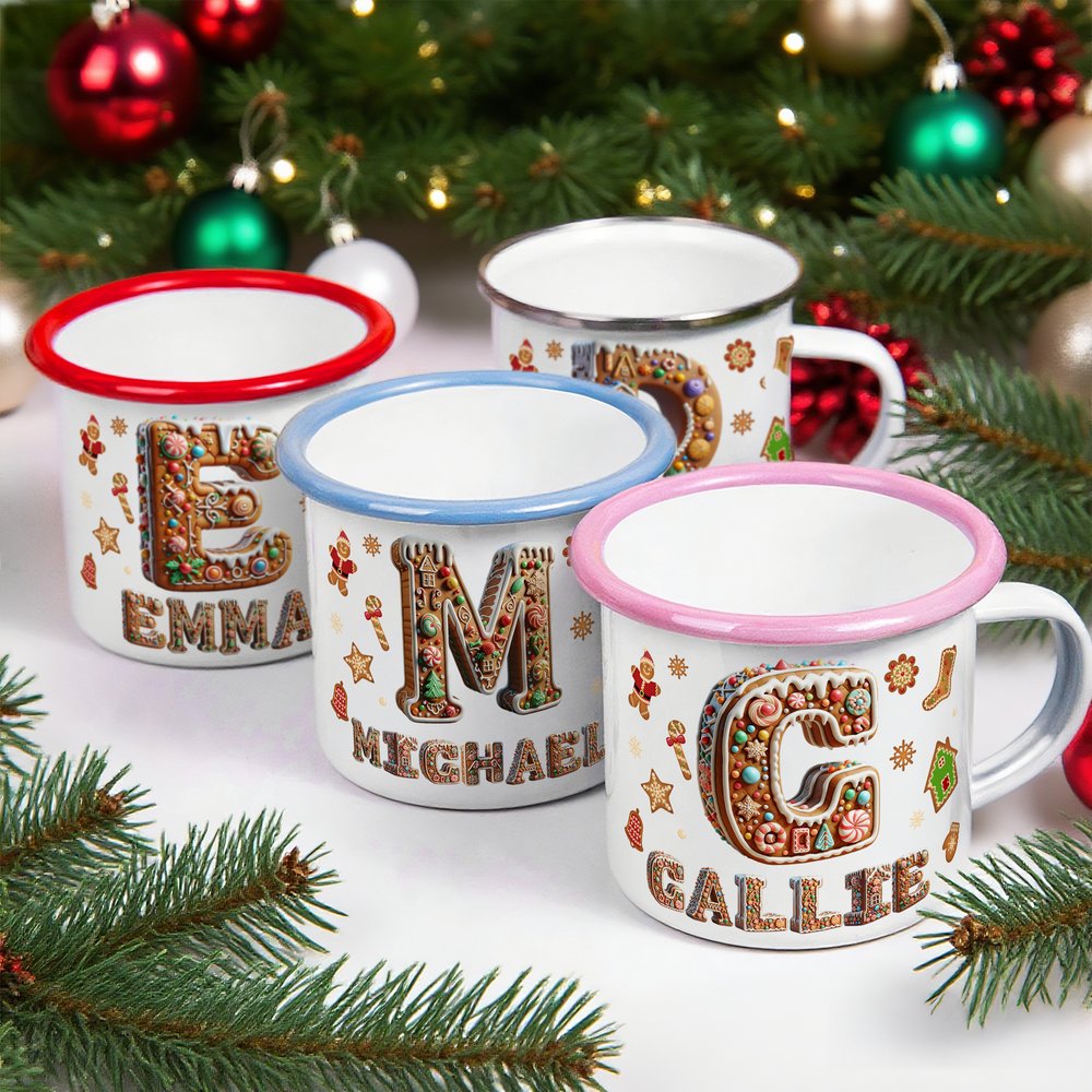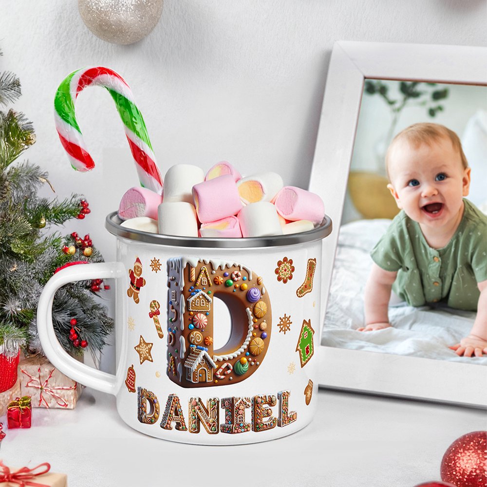 This enamel mug transforms Christmas gingerbread men and candy elements into artistic letters, each letter resembling a miniature fairytale scene: gingerbread houses, icing lines, and colorful candies adorning the design, as if capturing the sweetness of the holiday season. The letters are cleverly integrated with your personalized name, making it a unique personal mark.