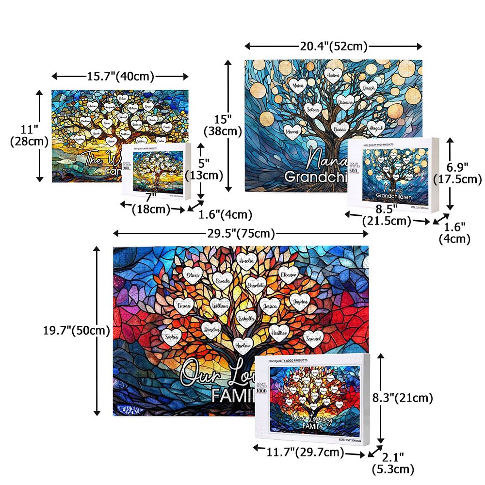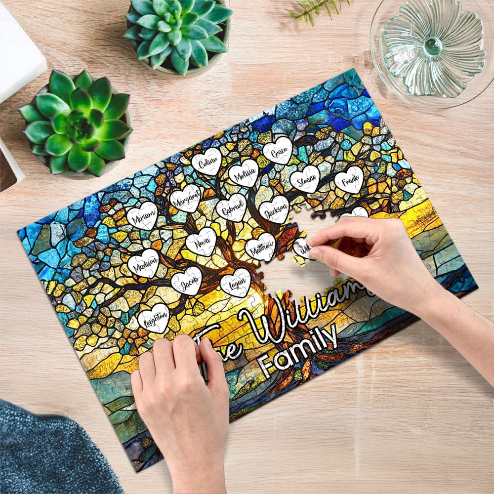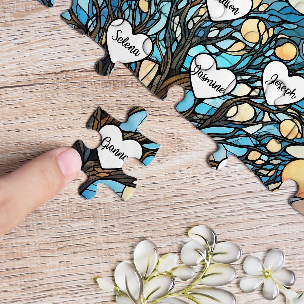 This puzzle is set against the backdrop of a stained glass-style tree of life, with a deep and powerful trunk and rainbow-like leaves, symbolizing the diversity and vitality of the family. You can customize 2-20 names of your loved ones, each of which is printed in a loving heart, giving each family member a unique position.