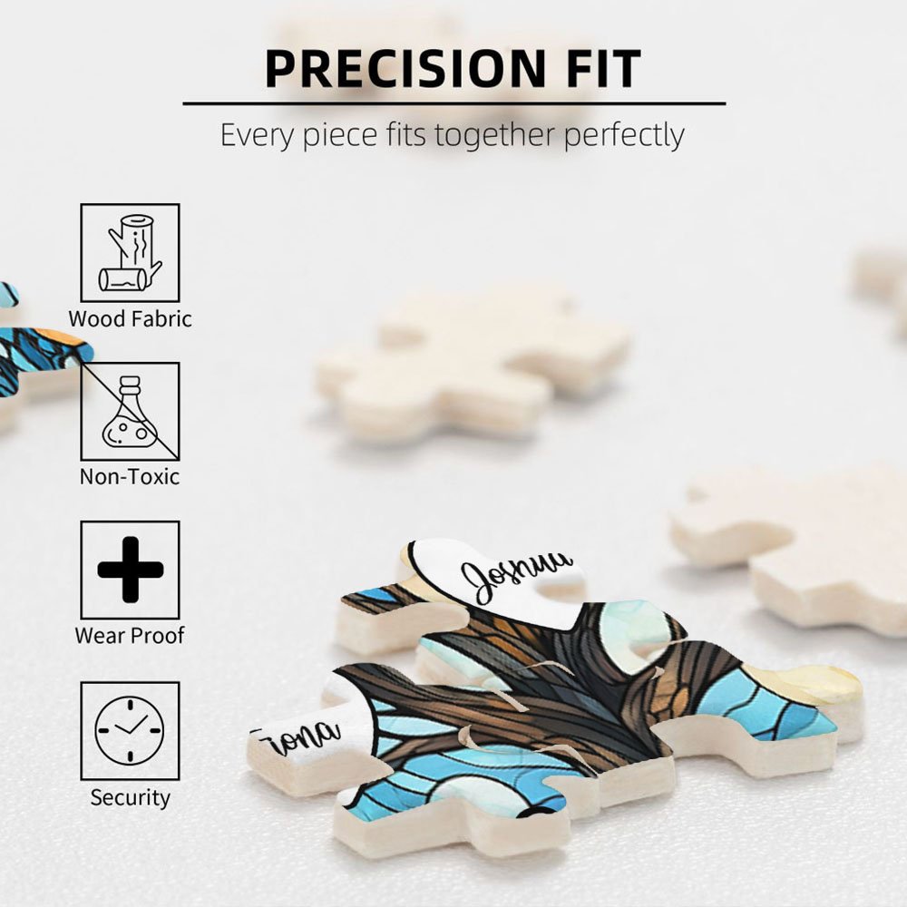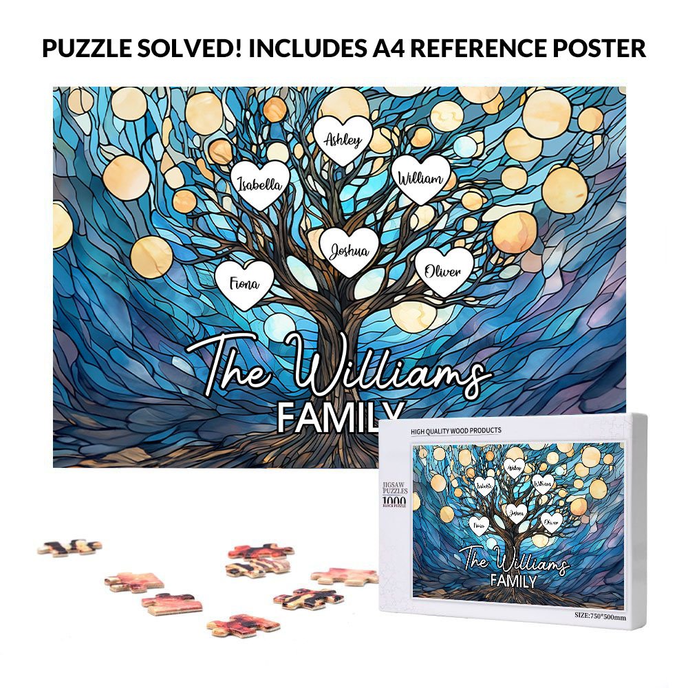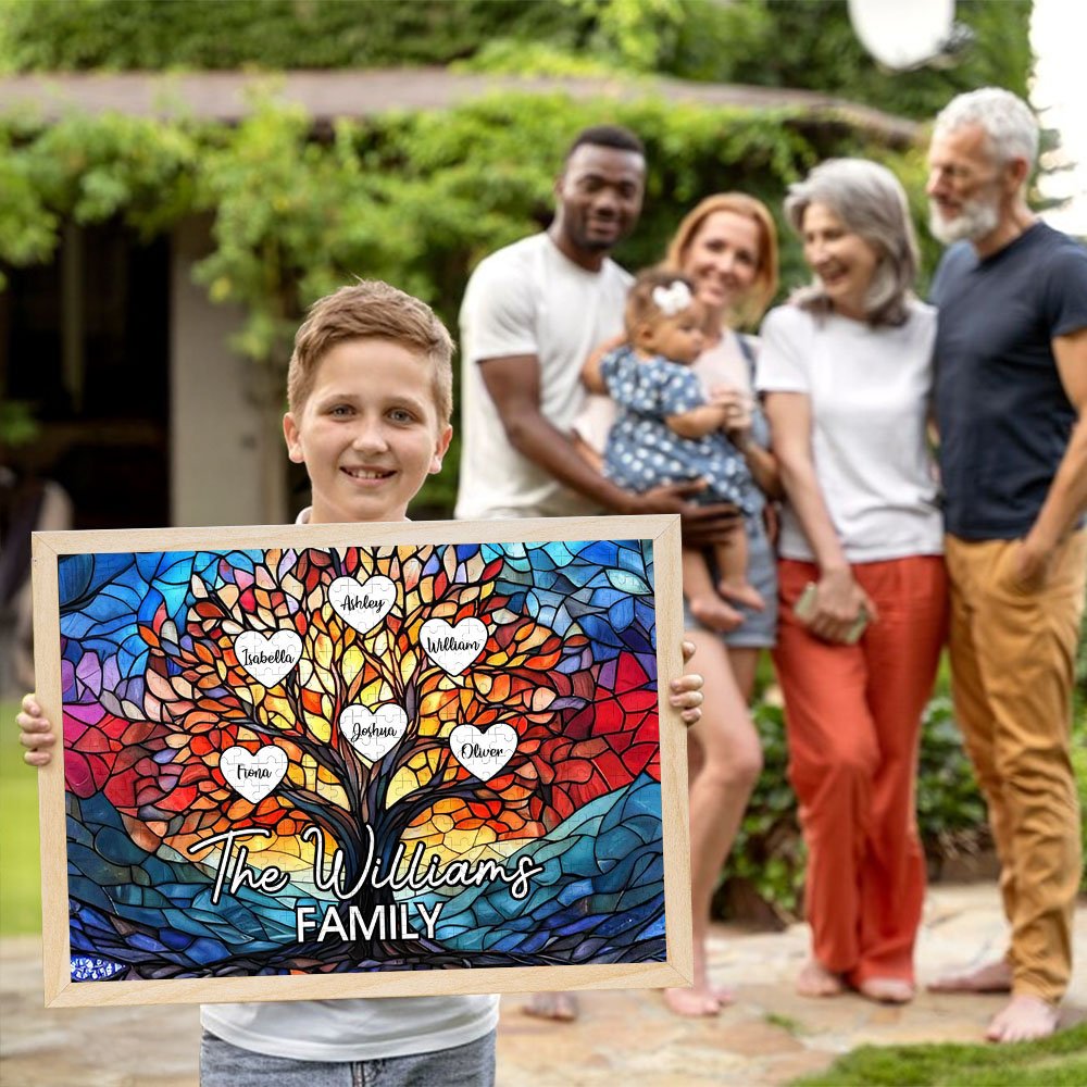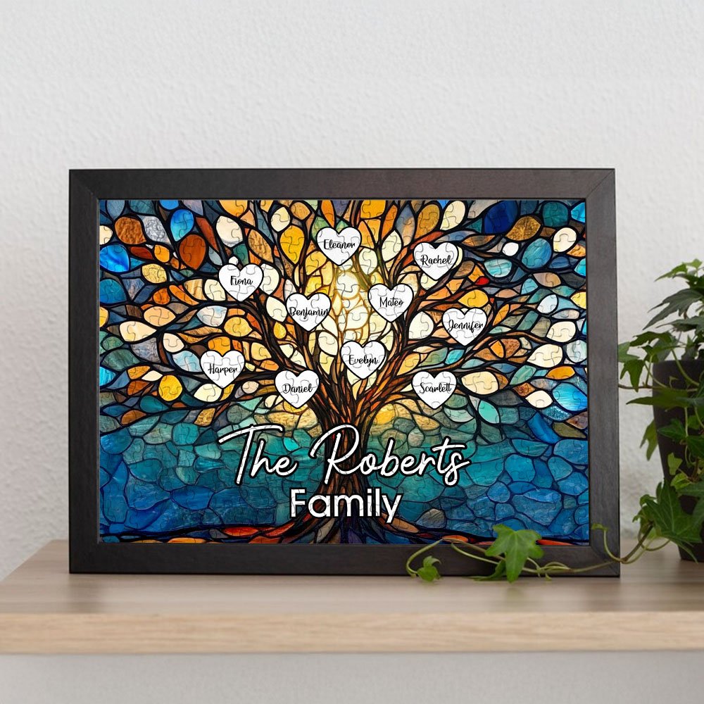This puzzle is set against the backdrop of a stained glass-style tree of life, with a deep and powerful trunk and rainbow-like leaves, symbolizing the diversity and vitality of the family. You can customize 2-20 names of your loved ones, each of which is printed in a loving heart, giving each family member a unique position.