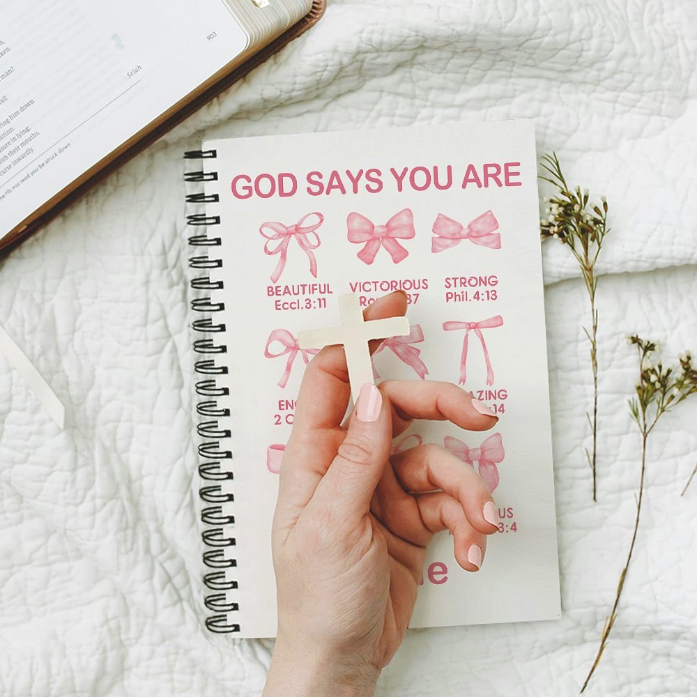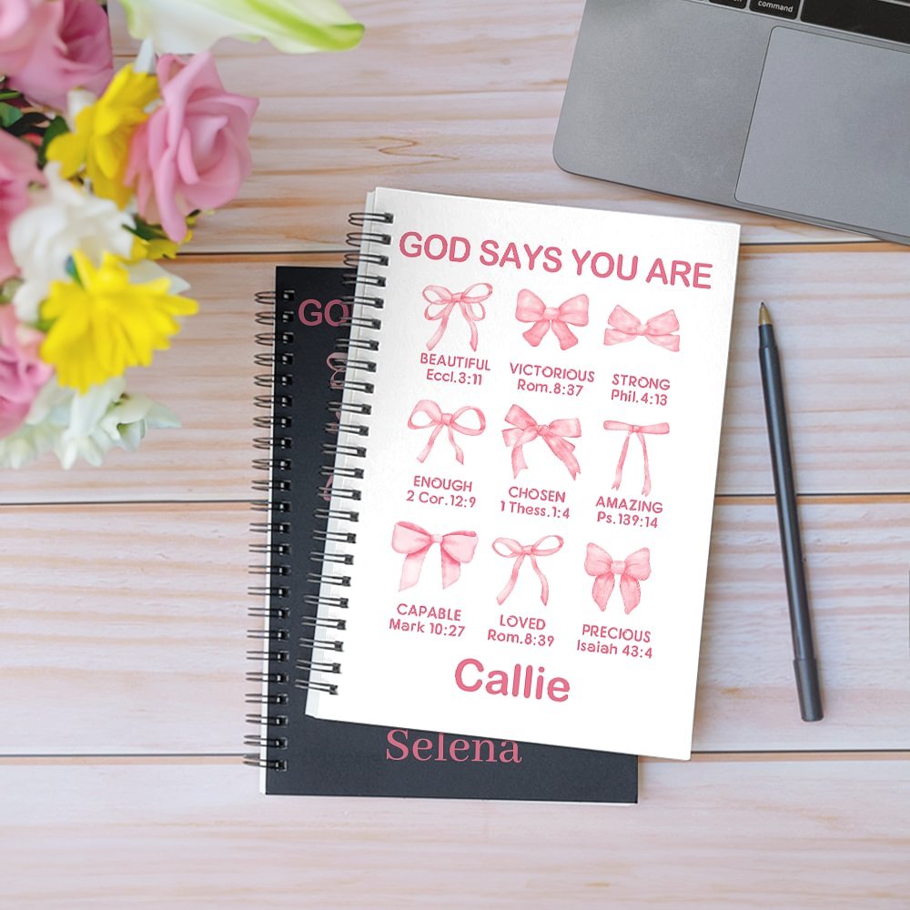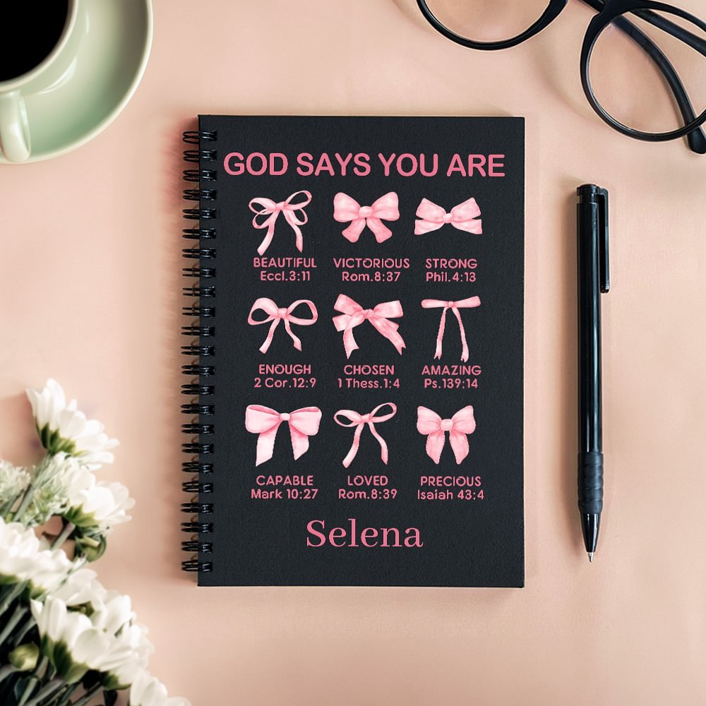 This beautifully designed A5 spiral notebook features an elegant bow-knot and can be personalized with your name. Along with the uplifting message "God Says You Are Beautiful, Victorious, Strong..." it offers a heartfelt way to inspire and empower daily reflections.