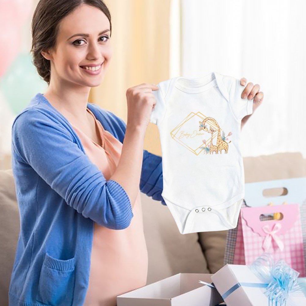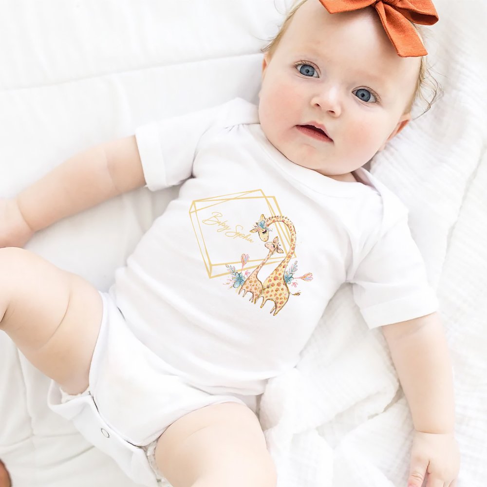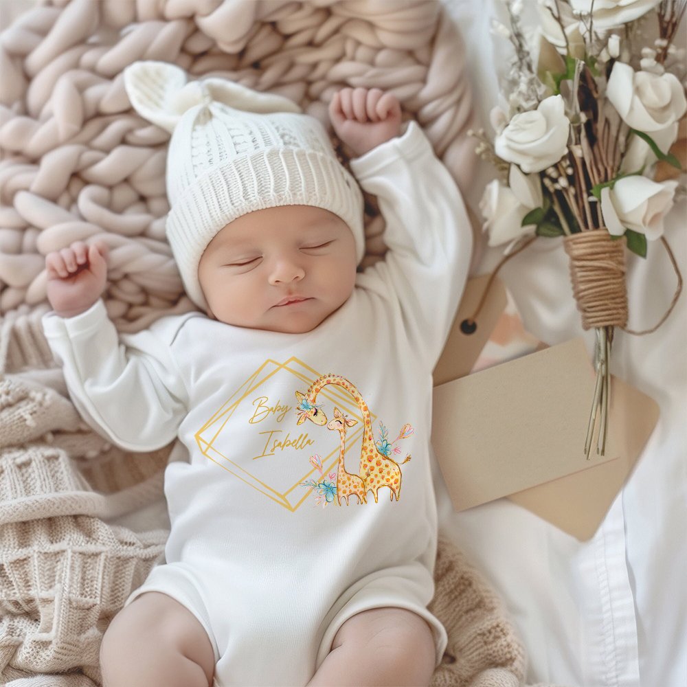 This bodysuit and swaddle set features the elements of a giraffe mother and baby, with a soft yellow color overall, and a cute and warm style. You can also personalize it with the baby's name to create a unique look for your child.