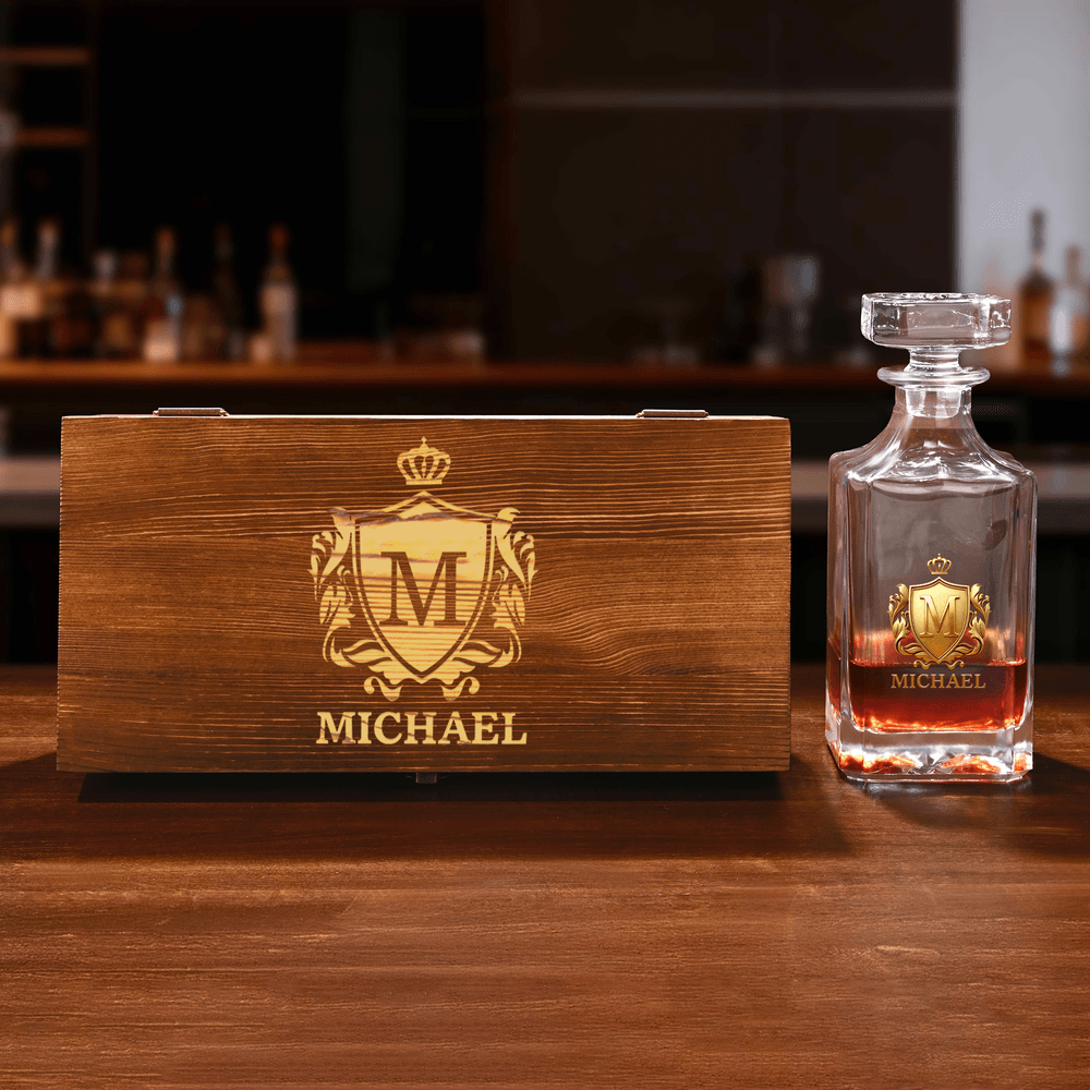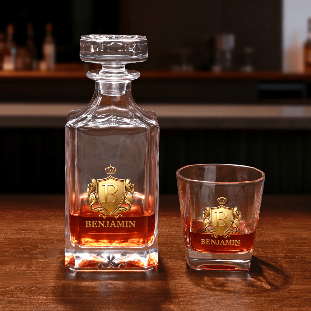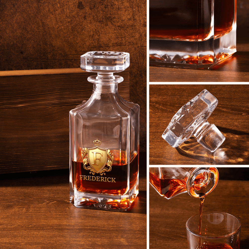 Our whiskey decanter features a distinctive gold shield design that combines classic and modern elements, showcasing luxury and sophistication. We offer customization options for initials and names on the glassware, making this set a true work of art that allows you to savor every moment of enjoying whiskey.