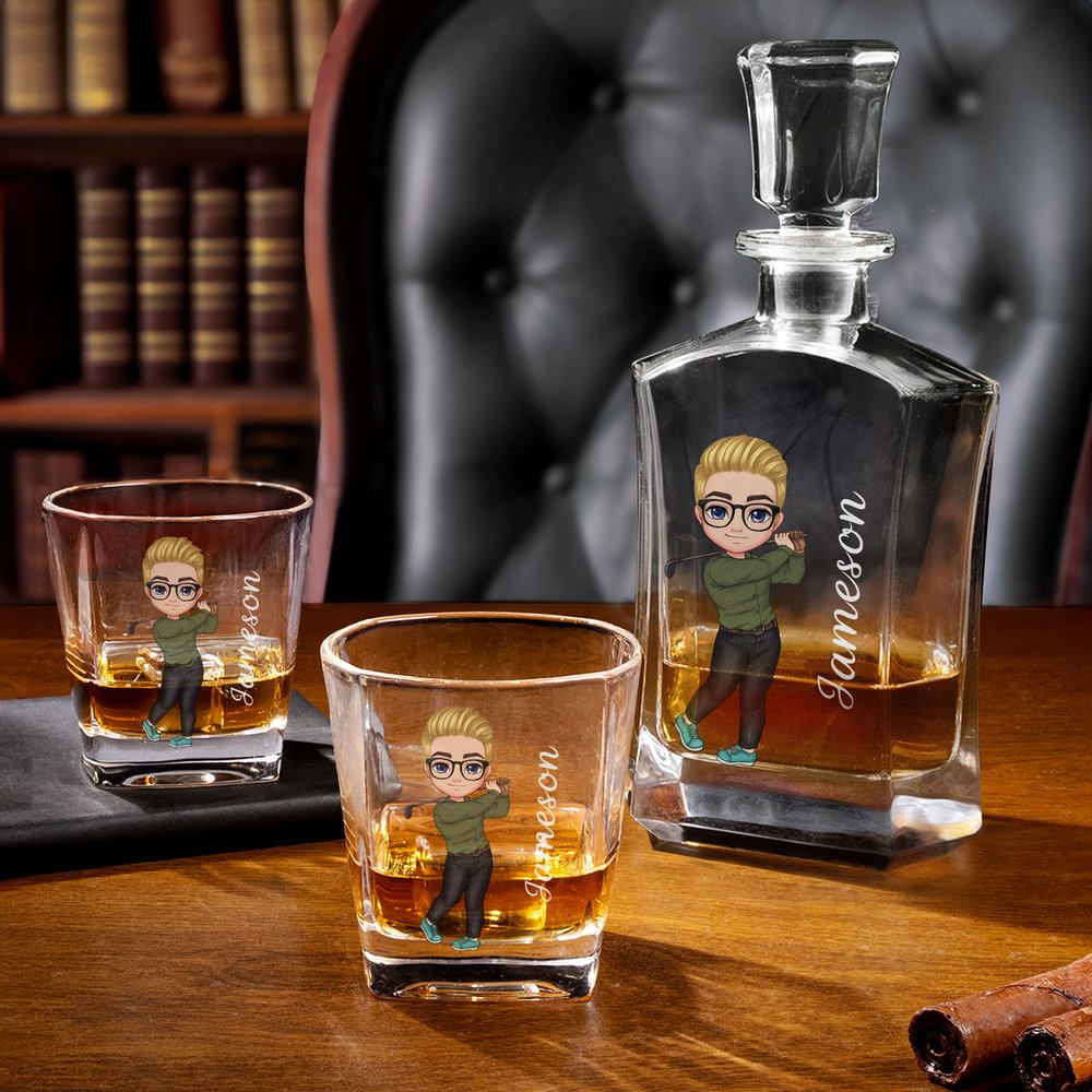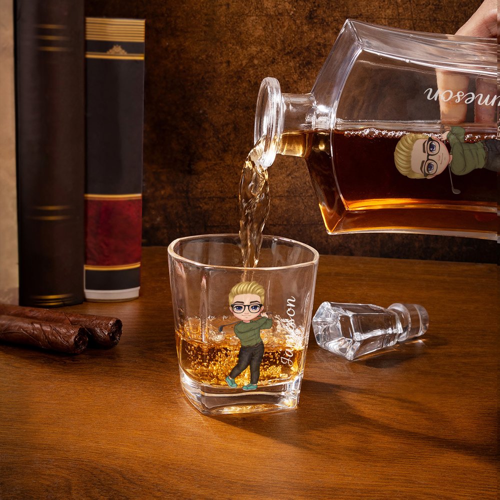 Personalized Golf Cartoon Character Whiskey Decanter Glasses with Engraved Name Father's Day Birthday Gift for Golf Players Whiskey Lovers