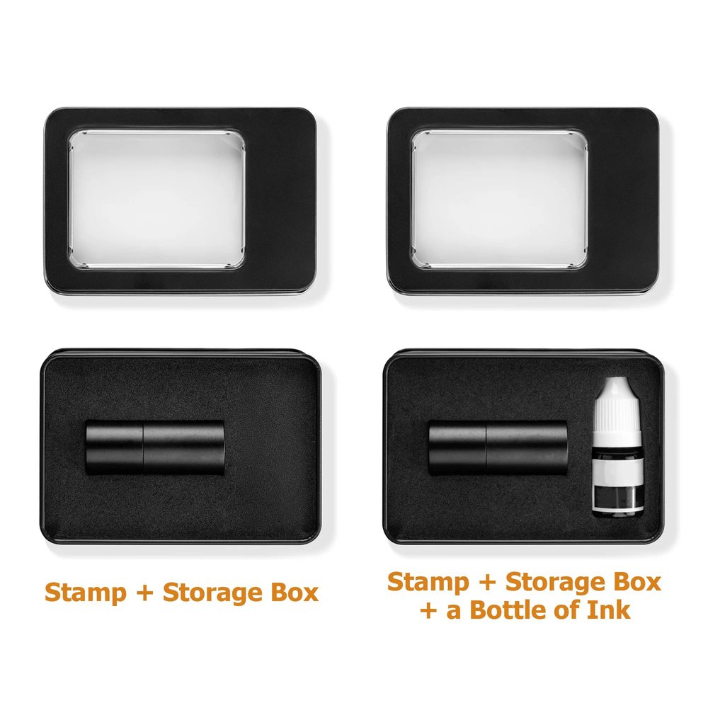 Measurement: Small Black Stamp with Storage Box Stamp Diameter - 0.59"(1.5cm), Stamp - 2.08" × 0.85"(5.3cm × 2.15cm), Storage Box - 4.21" × 2.83" × 1.18"(10.7cm × 7.2cm × 3.0cm) Big Colored Stamp Stamp Diameter - 0.79"(2cm), Stamp - 2.44" × 1.09"(6.2cm × 2.77cm)