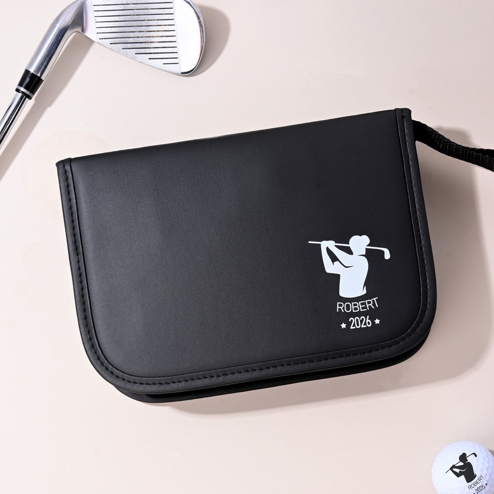 This golf organizer pouch features a sleek, compact design crafted from premium PU leather, available in classic black and rich brown. The front can be personalized with a custom name and year, alongside iconic golf motifs like crossed clubs or a golfer's silhouette, creating a one-of-a-kind accessory.