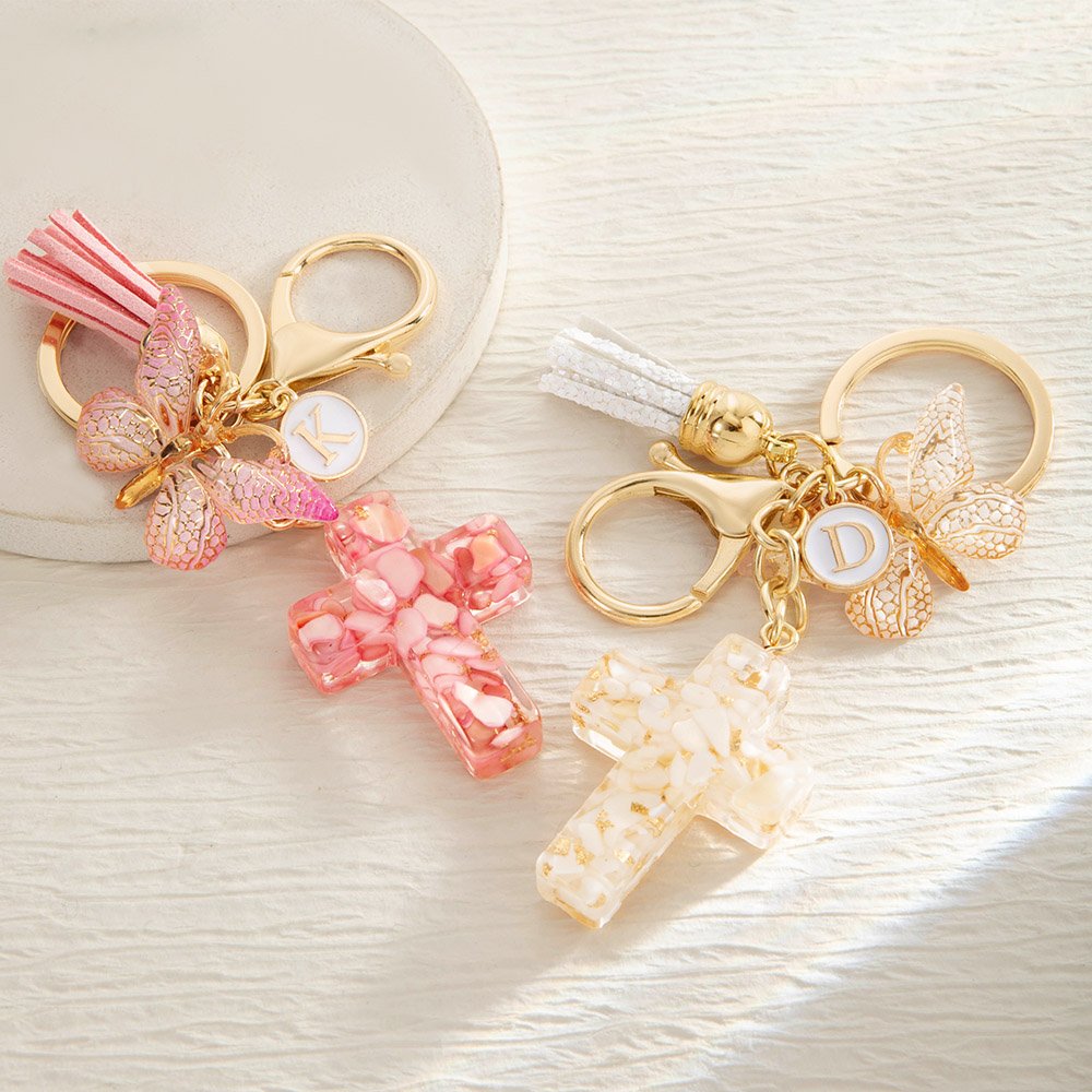 Carefully handcrafted from premium clear resin, this beautiful cross keychain features a tassel and a smooth polished finish. Its beauty is enhanced by vibrant colors and a delicate butterfly charm, which can be customized with your initials, making it a stylish and meaningful accessory for everyday use.