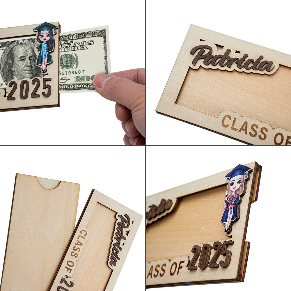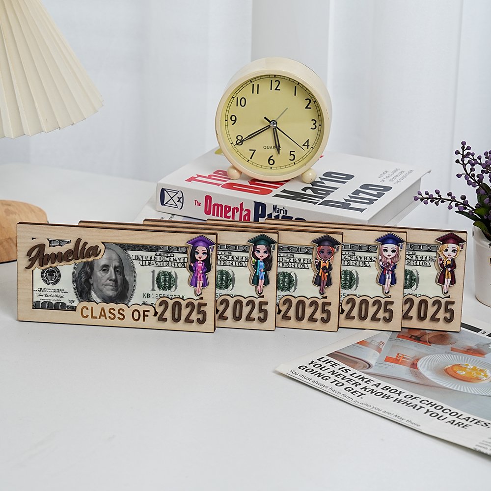 Our money holder features a cartoon graduation girl and the words "Class of..." perfectly showcasing graduates' style and achievements. It can be customized with the graduate's image, name, and year to create a unique and meaningful keepsake to celebrate them.