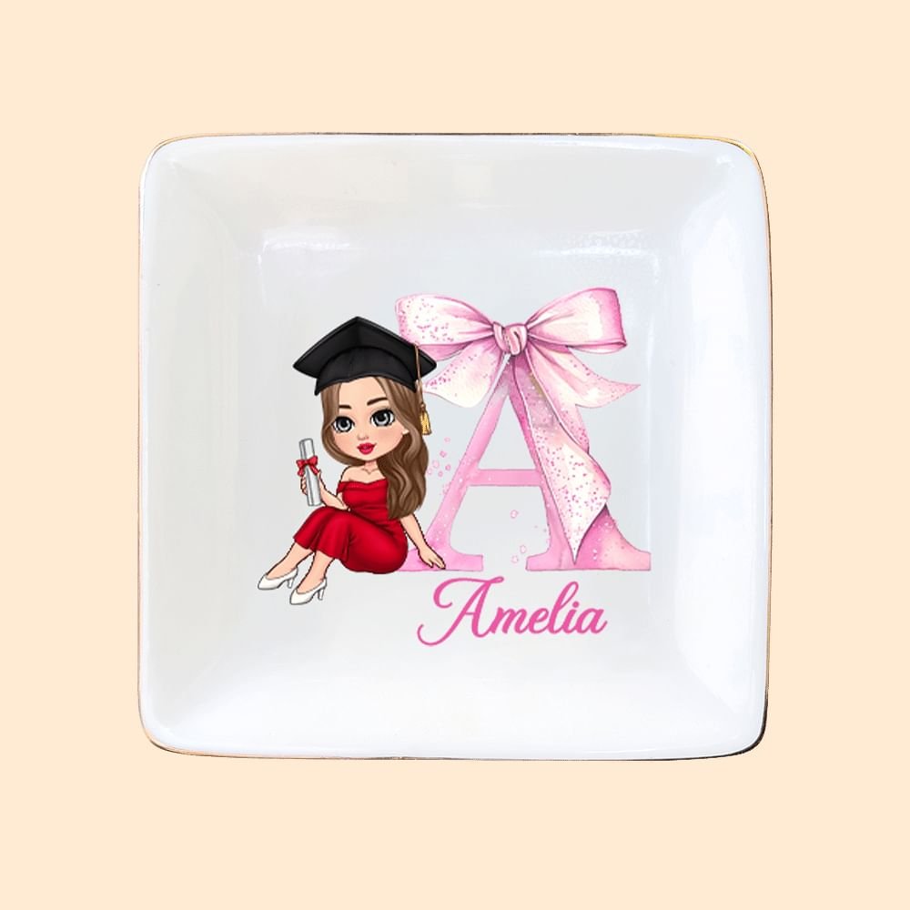 This jewelry dish can be personalized with cartoon graduation characters and combines elements of pink bows and initials, which are elegant and sweet, perfectly showing the style and achievements of the graduating girl. You can customize the graduate's name to create a unique and meaningful souvenir to congratulate them.