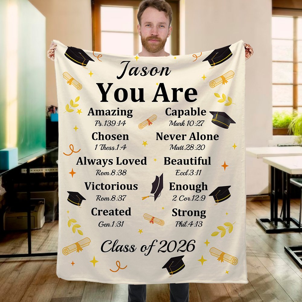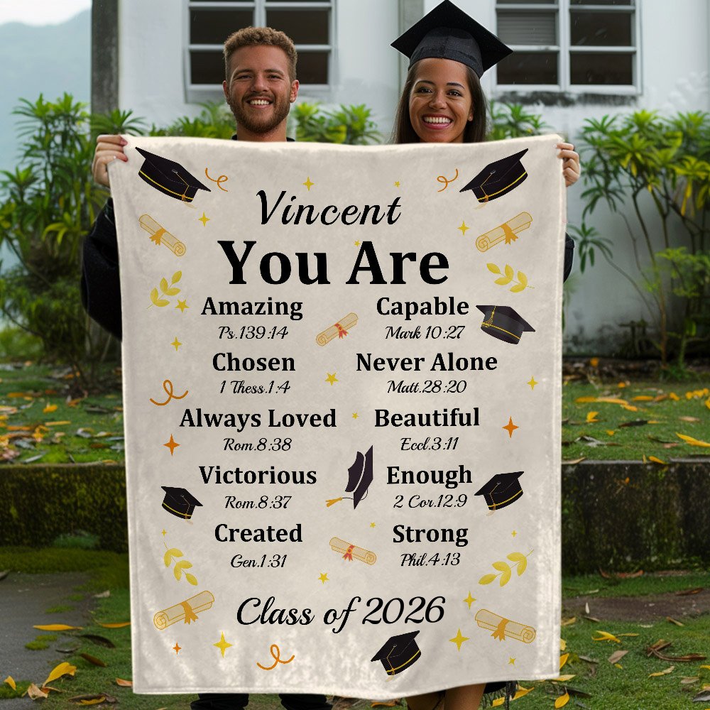The design of this blanket combines religious beliefs with the celebration of academic achievement. Not only are the names and graduation years printed on the blanket but also the inspiring words of Bible chapters, such as "Amazing," "Capable," and "Never Alone," are carefully selected. In addition, the blanket is decorated with graduation elements such as graduation caps and stars, adding to the celebratory atmosphere.