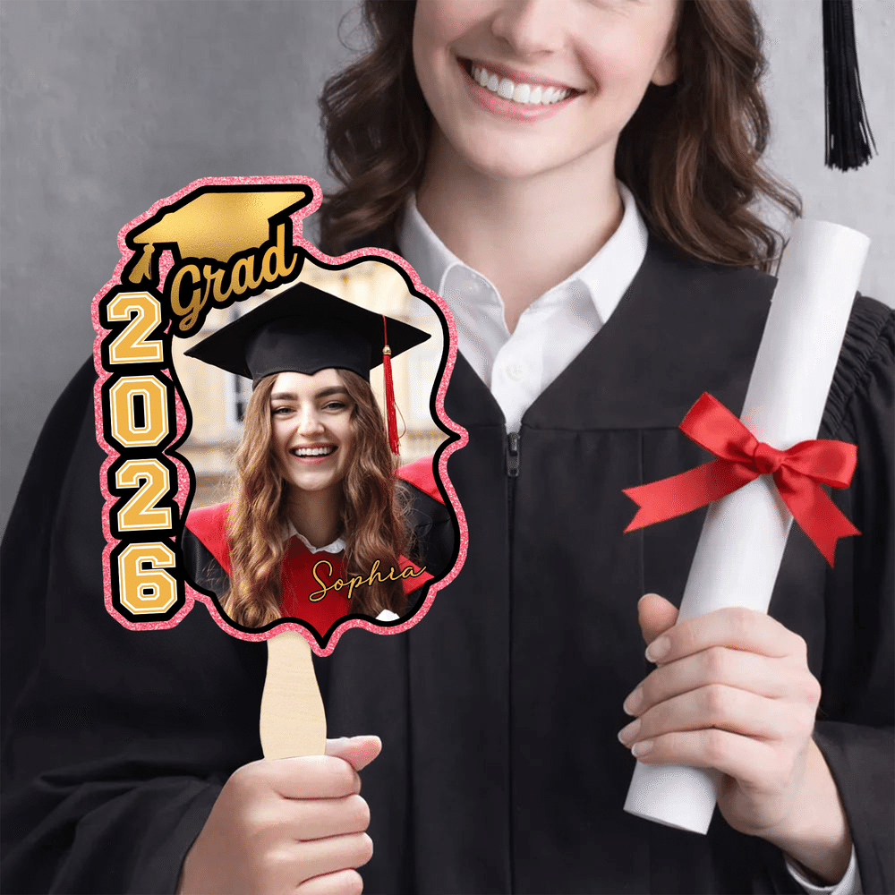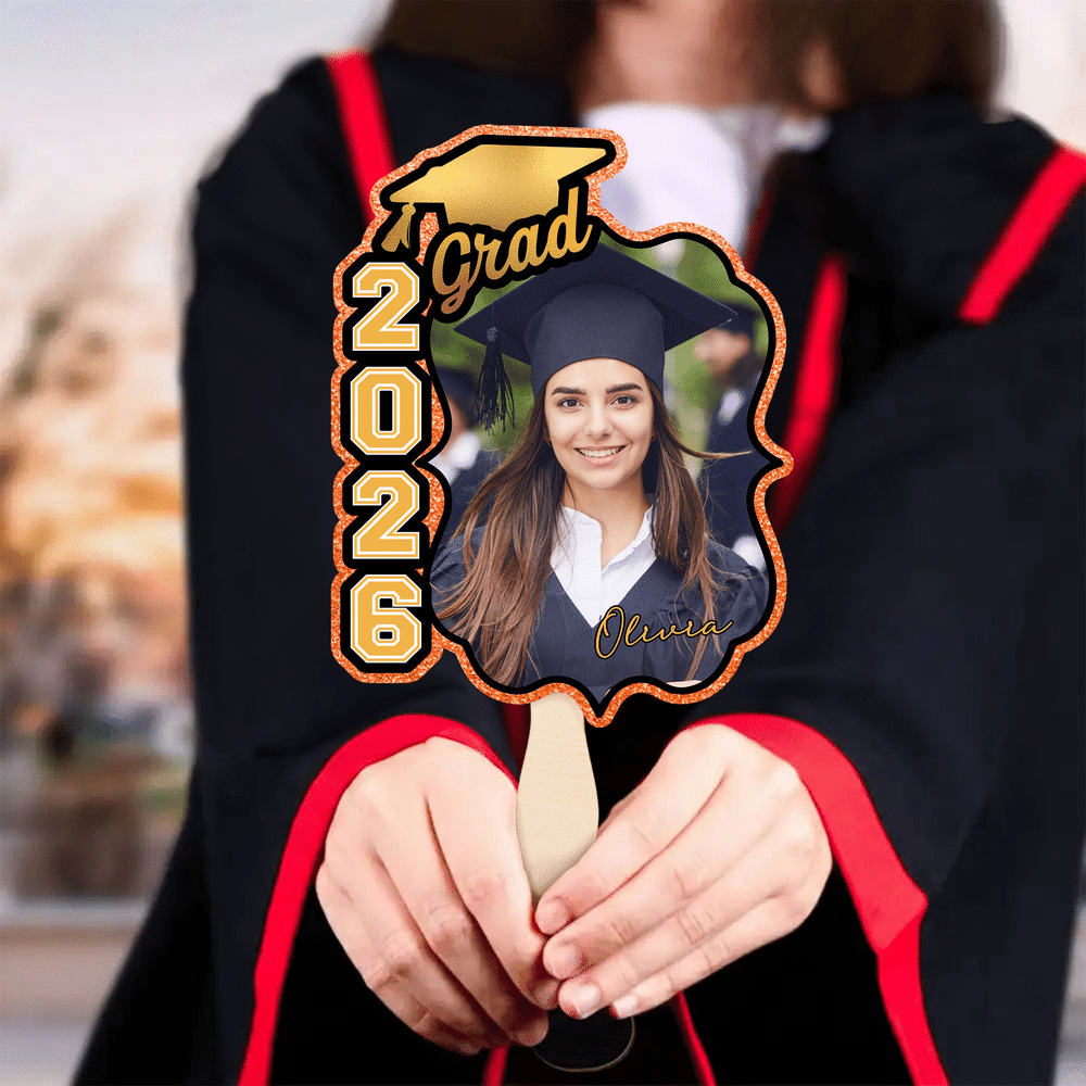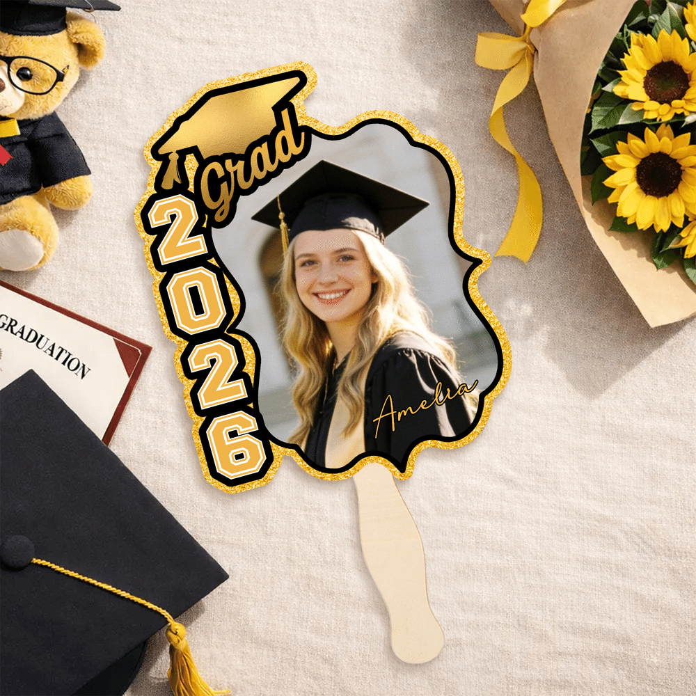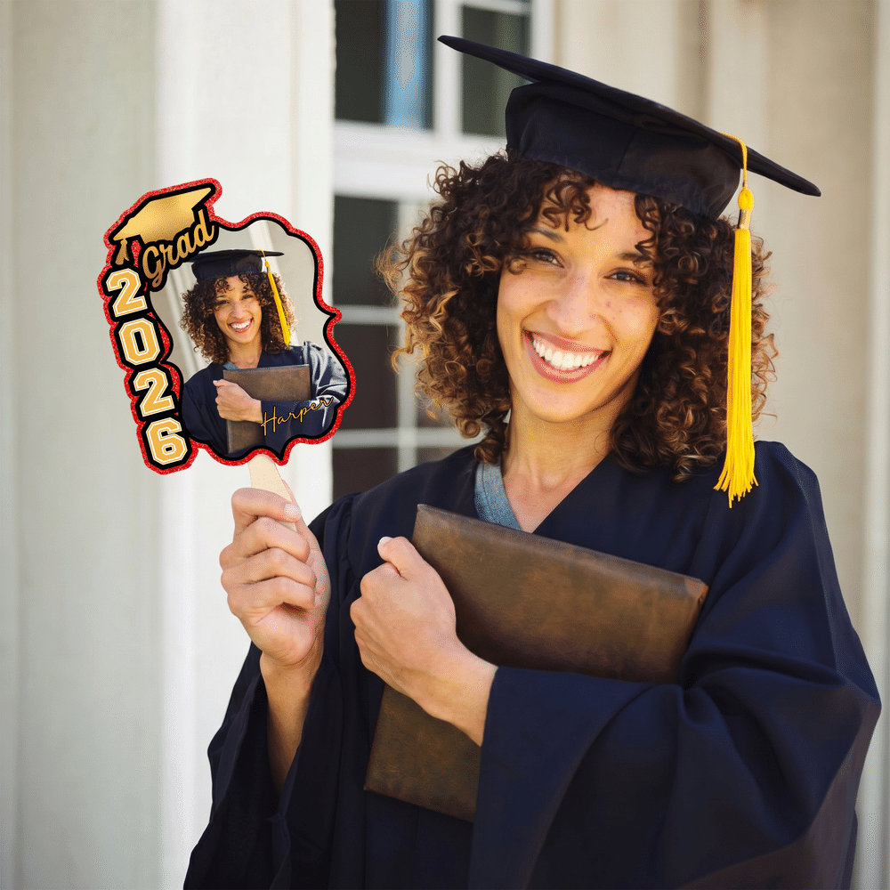 Designed exclusively for the Class of 2026, this graduation fan allows you to customize your portrait photo, name, and glitter border color. Featuring a graduation cap and gold foil elements, paired with a wavy glitter border, it creates a unique keepsake that stands out from generic party favors.