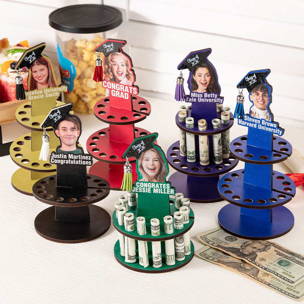 This graduation money holder features a cake shape and is both a practical and playful gift for graduates. You can customize a graduate's photo and personalize the graduation year, name, and even their school name to the money holder, ensuring that the gift becomes a cherished memento they can proudly display.