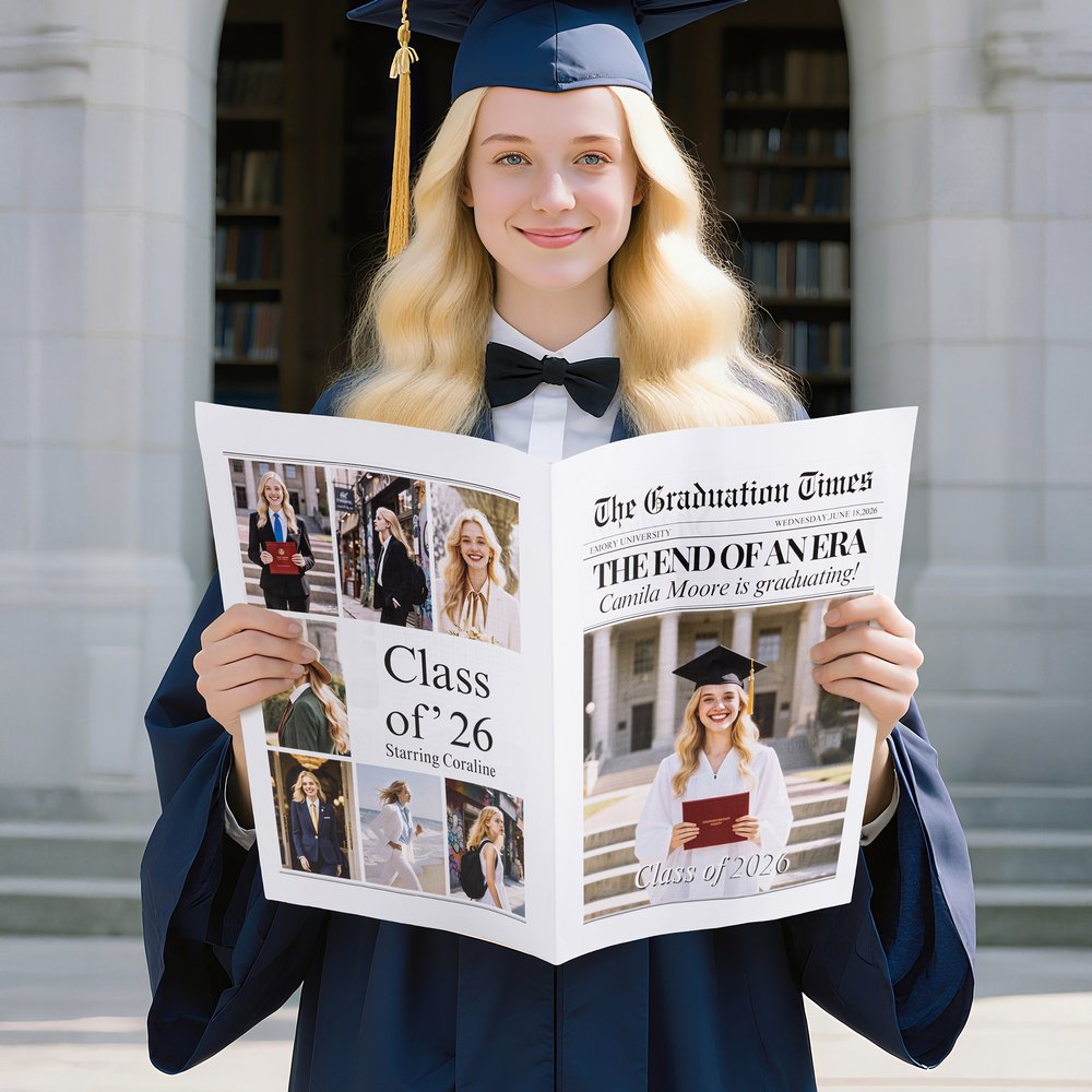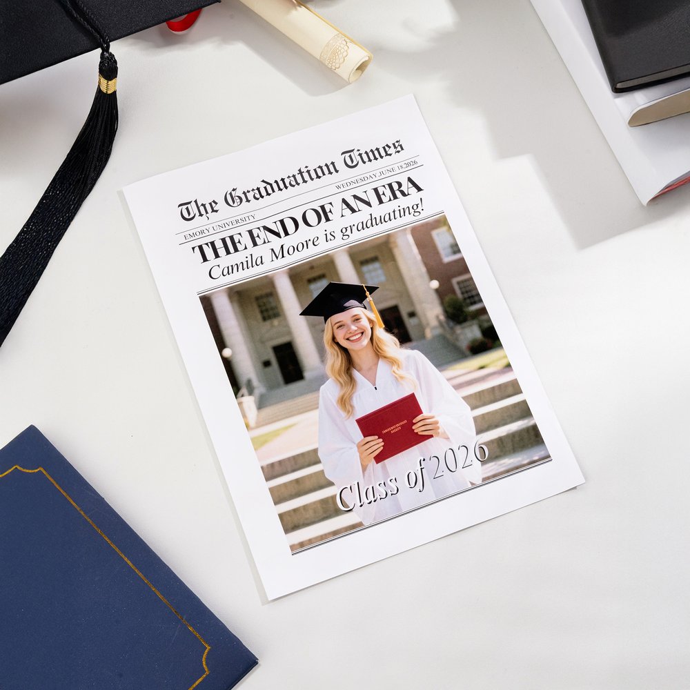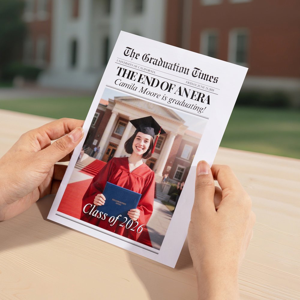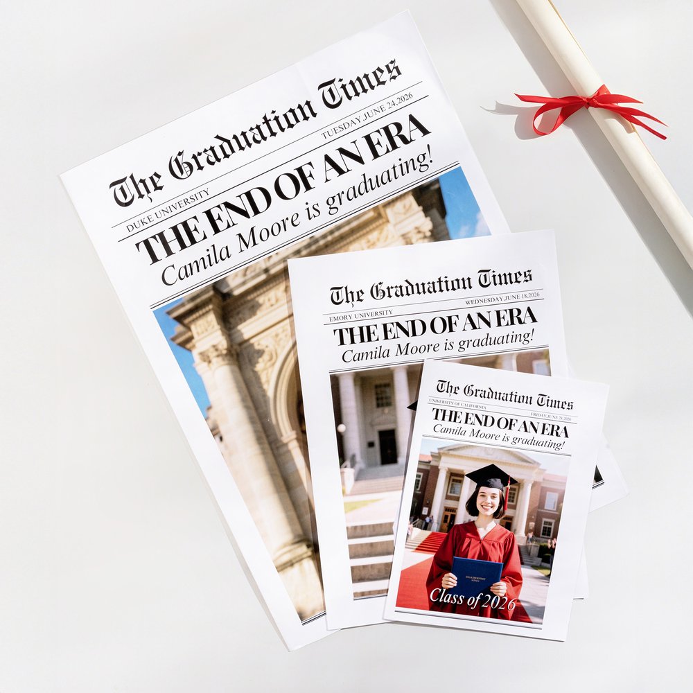 Our customizable graduation newspaper lets you make your graduation announcement truly unforgettable. Whether you're graduating from high school, college, or other academic institutions, you can personalize it with photos, your name, and your year. It's a perfect way to share your achievements with family and friends in a unique, personalized manner.