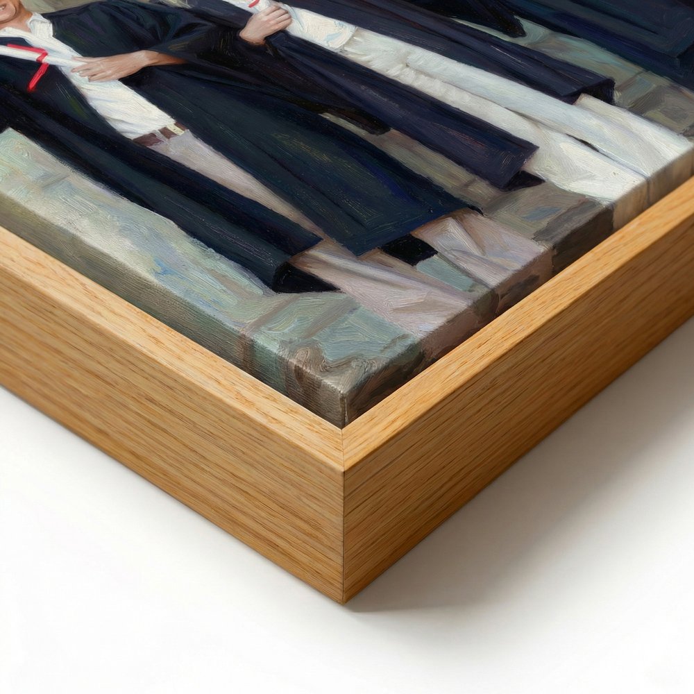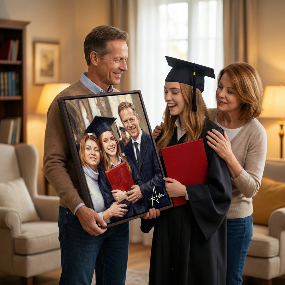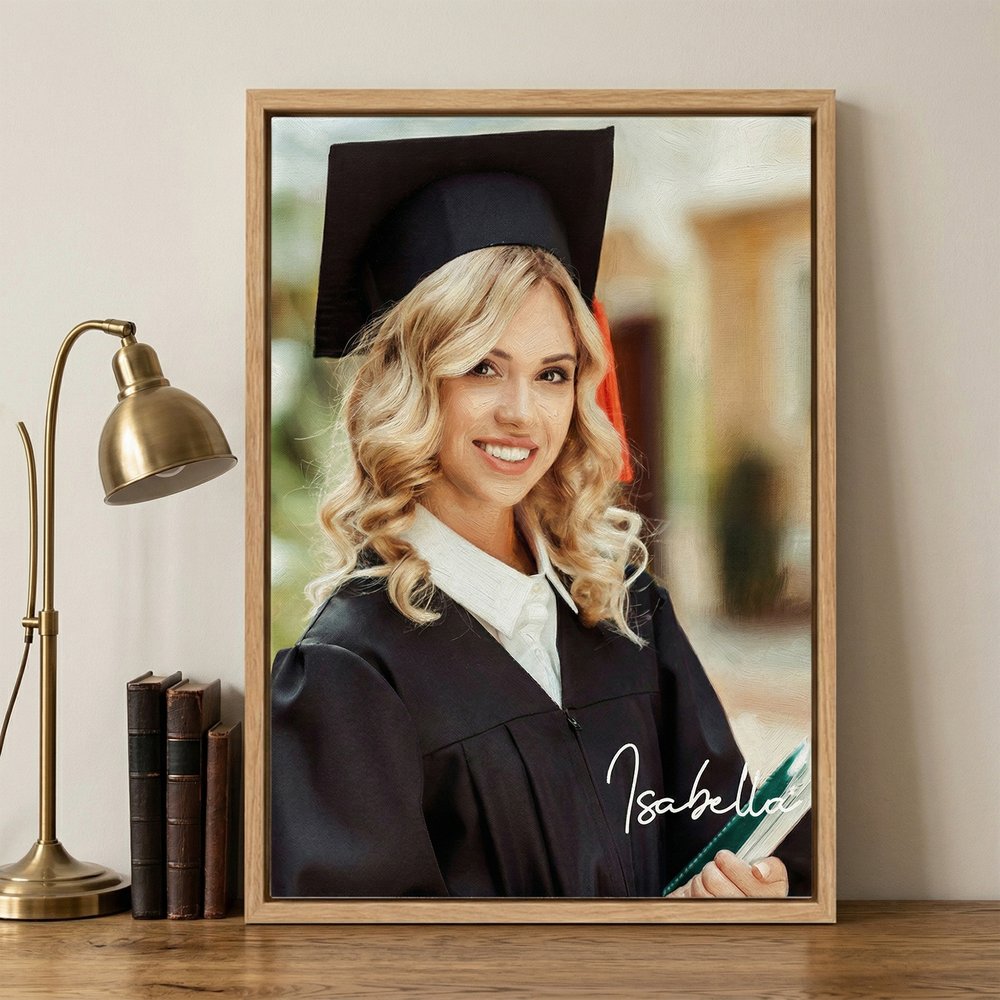 Transform your favorite graduation snapshot into a timeless fine-art oil-painting-style portrait print. We print your single high-resolution photo directly, keeping the composition clean and fully focused on the smiling graduate at the center. You can add a custom handwritten-style name signature on the artwork for a fully personalized touch, turning a fleeting graduation moment into an elegant, everlasting commemorative masterpiece.