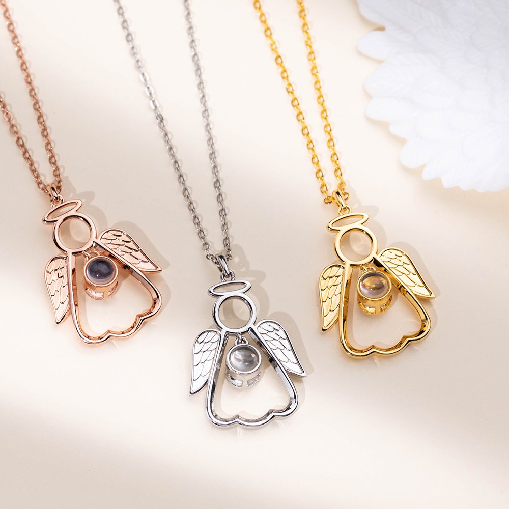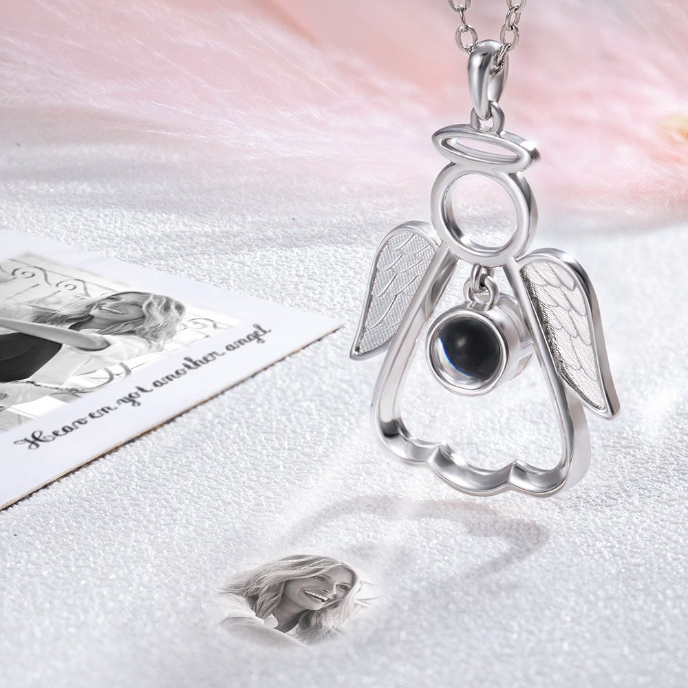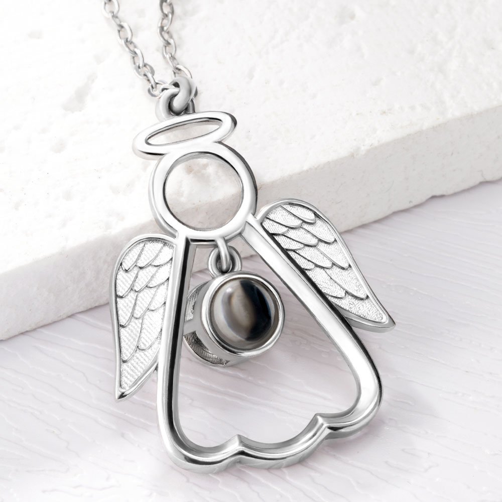 This angel guardian pendant has a projection stone inlaid in the middle, you can upload photo of your deceased relatives and project the photos out. A one-of-a-kind relief charm keepsake to heal your grieving family member or friend.