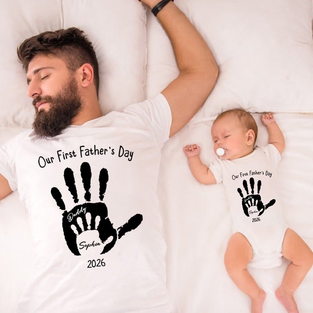 Personalized Our First Father’s Day Handprint 100% Cotton Baby Bodysuit T-shirt Matching Set with Name and Year Gift for Dad Baby