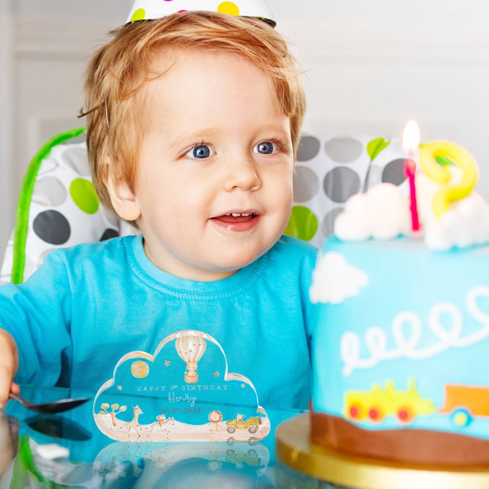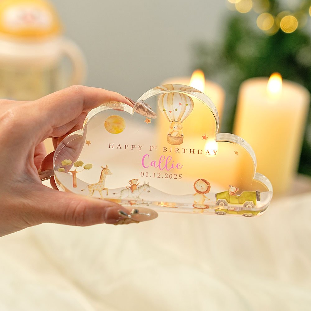 This acrylic plaque stands out with a sweet cloud-shaped design, creating a playful atmosphere in any room. It is printed with a variety of lively animals, like a tiger sitting in a hot air balloon, a galloping giraffe, a zebra, a lion gazing upward, and a mischievous monkey. The eye-catching title “Happy 1st Birthday” is the best wishes to every baby. You can customize your kids’ names and a date on the surface, making this plaque more unique.