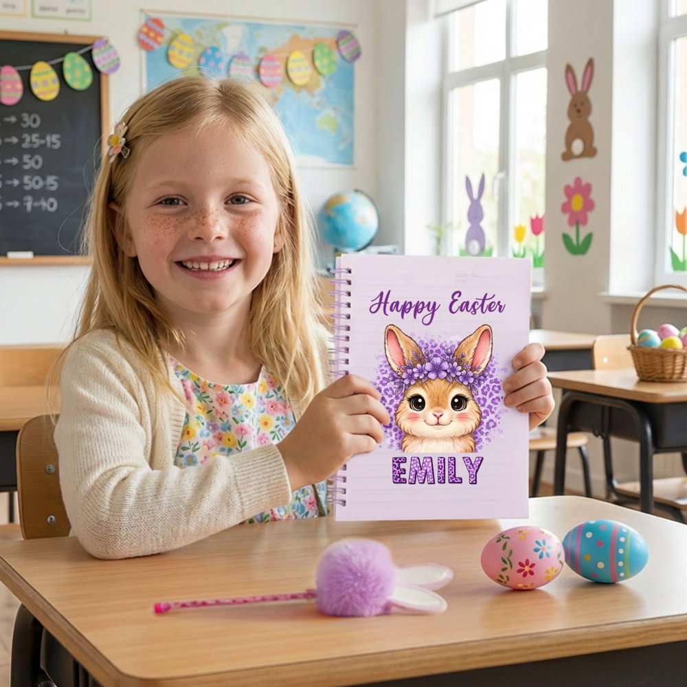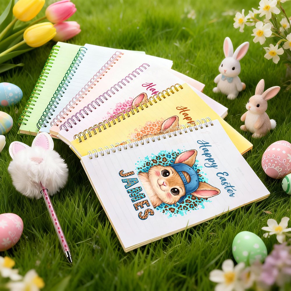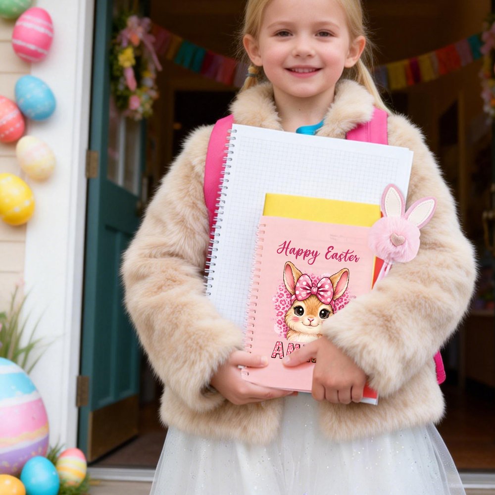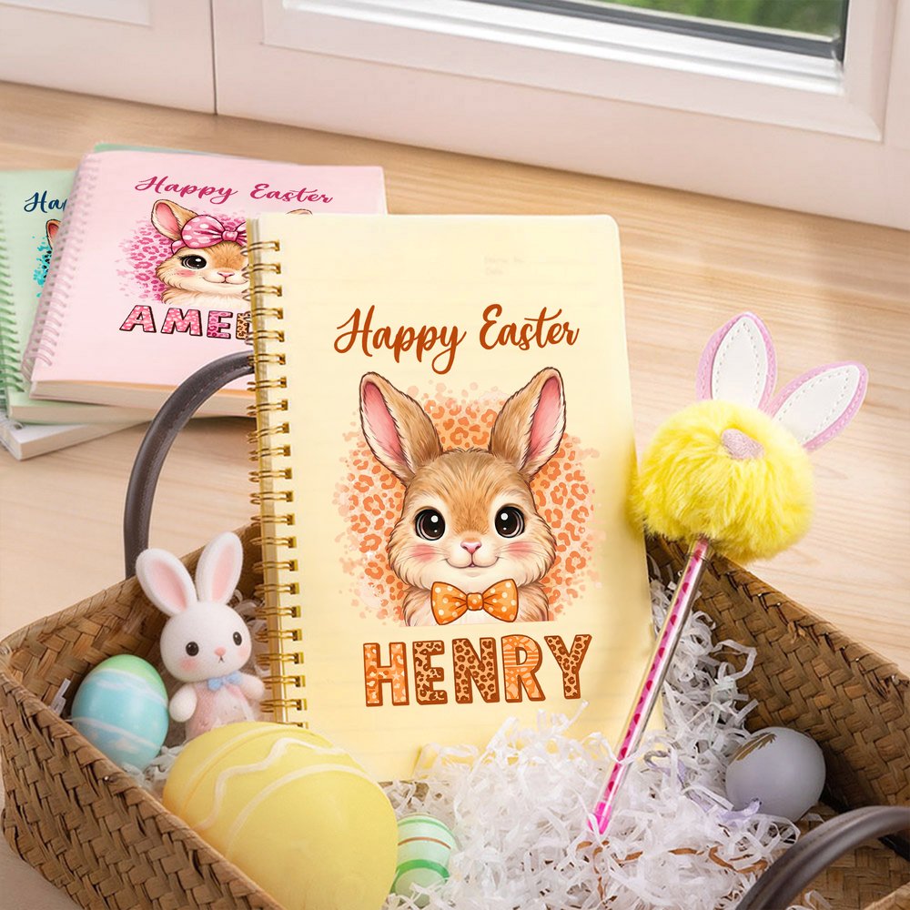 Personalized Happy Easter Cute Rabbit A5 Spiral Notebook and Pom Puff Pen Set with Lined Pages and Name Easter Gift for Boys Girls