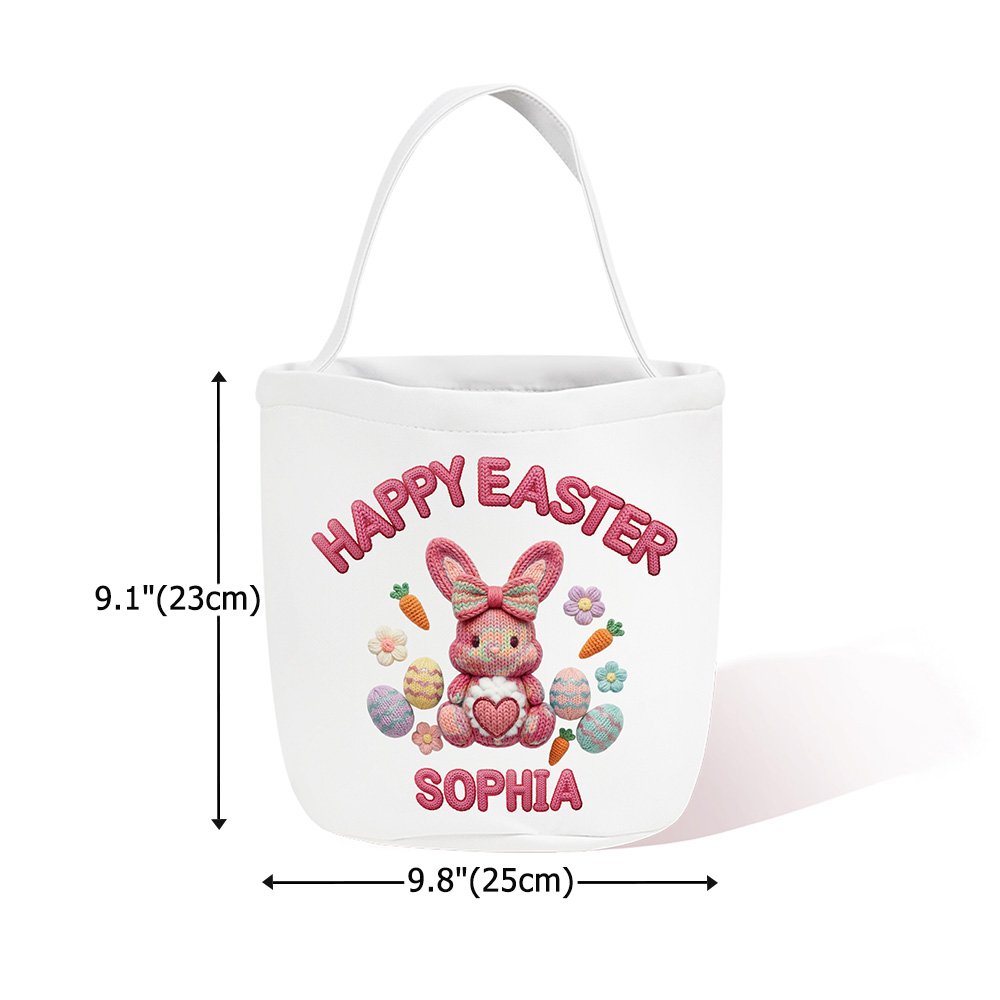 This Easter basket features a unique faux yarn effect bunny design, available in blue and pink. The adorable bunny is surrounded by easter eggs, carrots, and flowers, giving it a handcrafted and charming feel. The "HAPPY EASTER" holiday title is paired with the child's name, making each basket unique to the child.