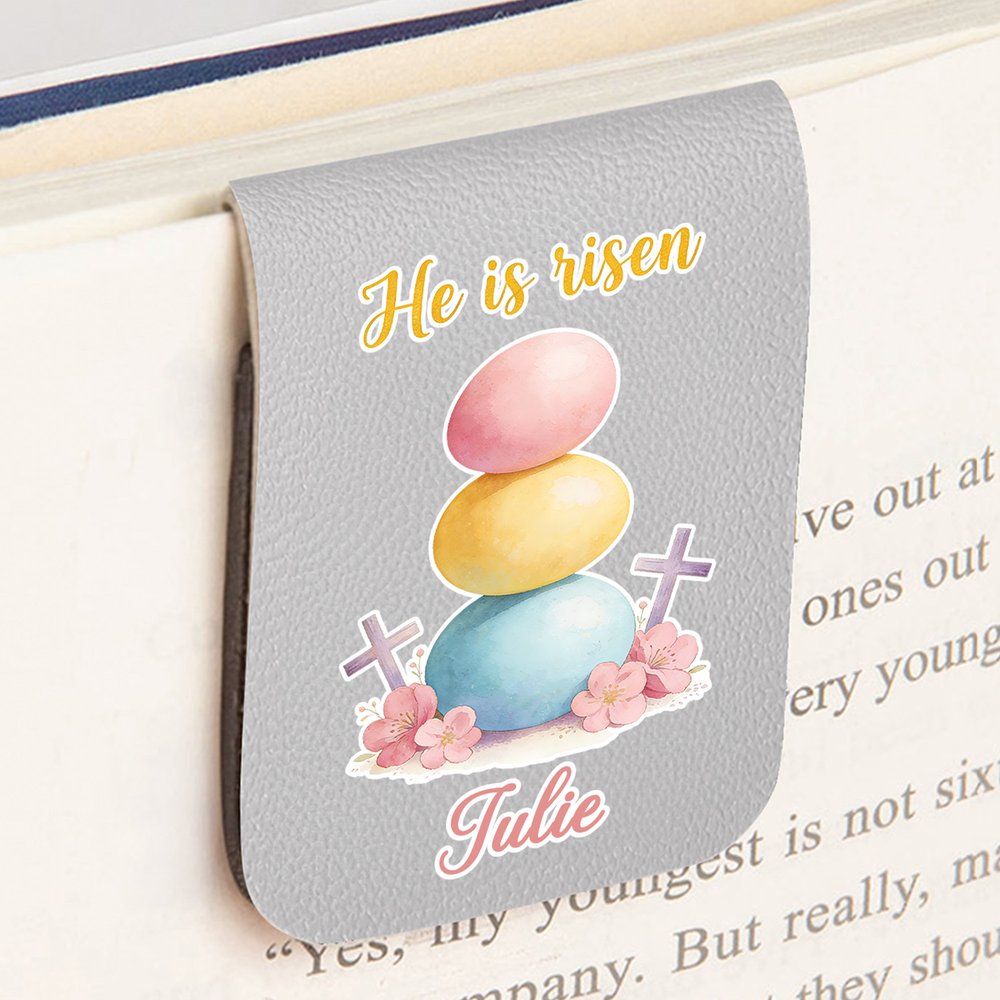 Visually, the bookmark has a warm, charming style. Its textured PU leather base features delicate watercolor designs of Easter elements, such as fluffy lambs, wooden crosses, or pastel eggs, paired with the phrase “He is risen”. Your name is printed in a playful, colorful font below, creating a cohesive look that blends religious meaning with festive charm.