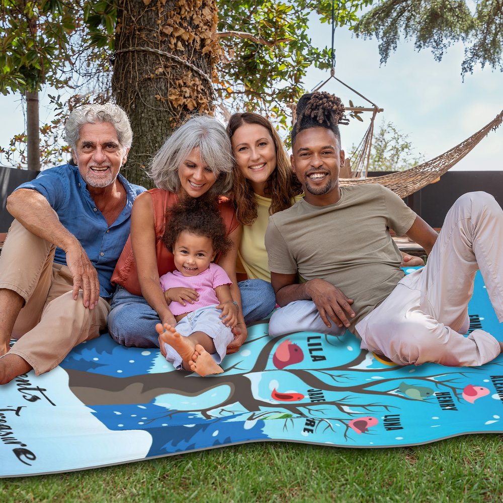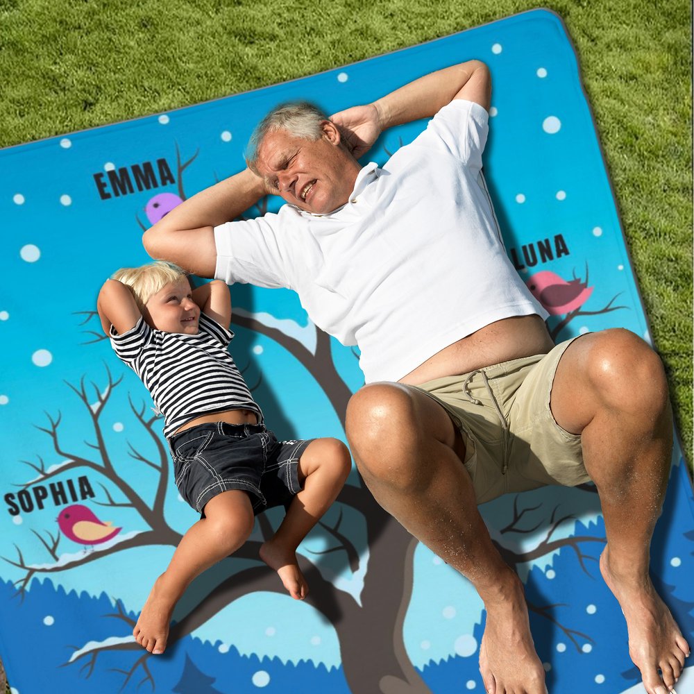 This custom grandma blanket features a snowy tree and colorful birds. Each bird can be personalized with your grandchild's name! Plus, custom text is available for an added touch of heartfelt sentiment. Create a one-of-a-kind piece that celebrates your special family bond.