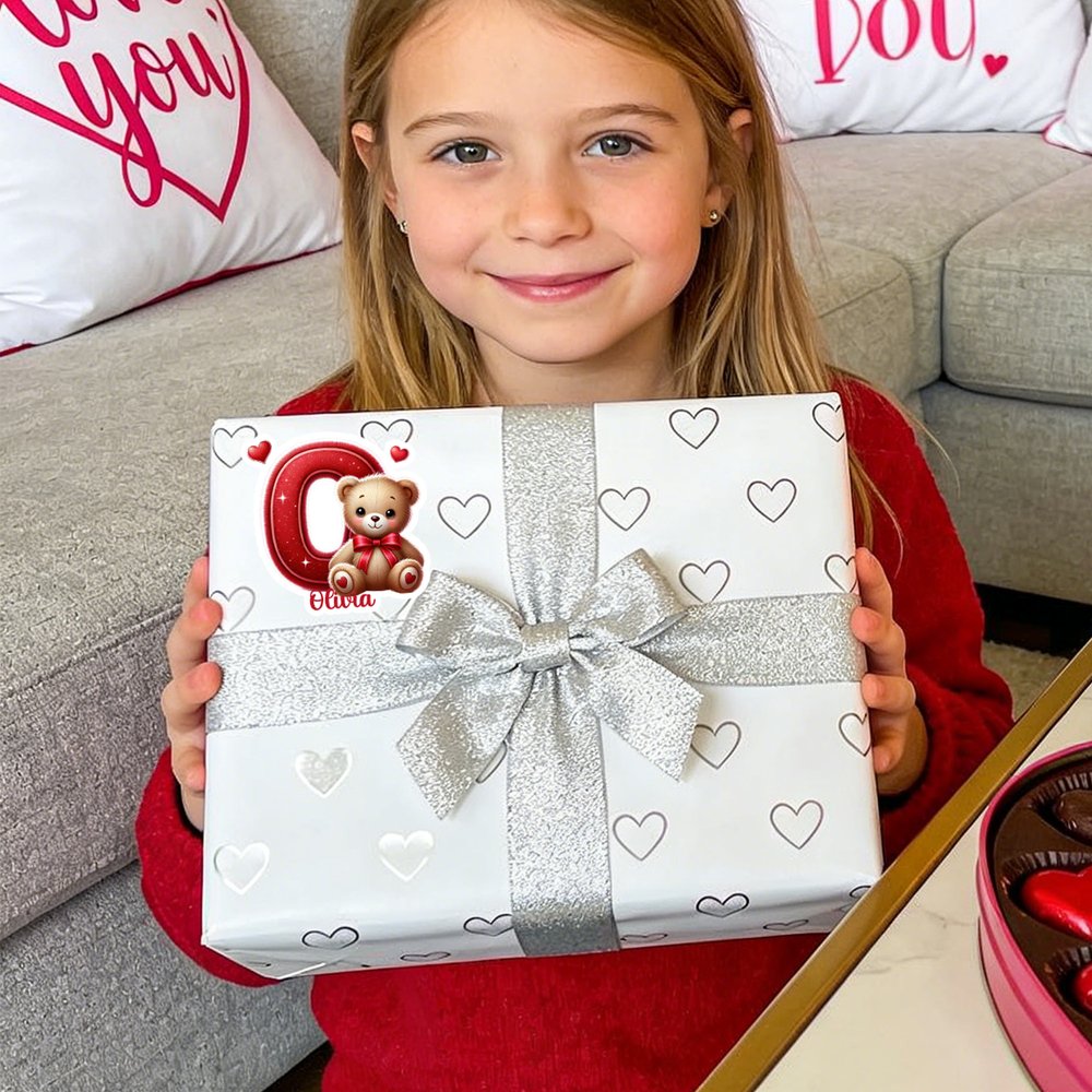 This adorable cartoon bear sticker is incredibly lifelike, featuring round, innocent eyes and a fluffy texture that seems almost tangible. It is irresistibly charming. The initials are displayed in vibrant red, with a rounded and full shape, accompanied by a small heart that exudes a strong Valentine's Day vibe. The option to customize the name makes this sticker truly unique.