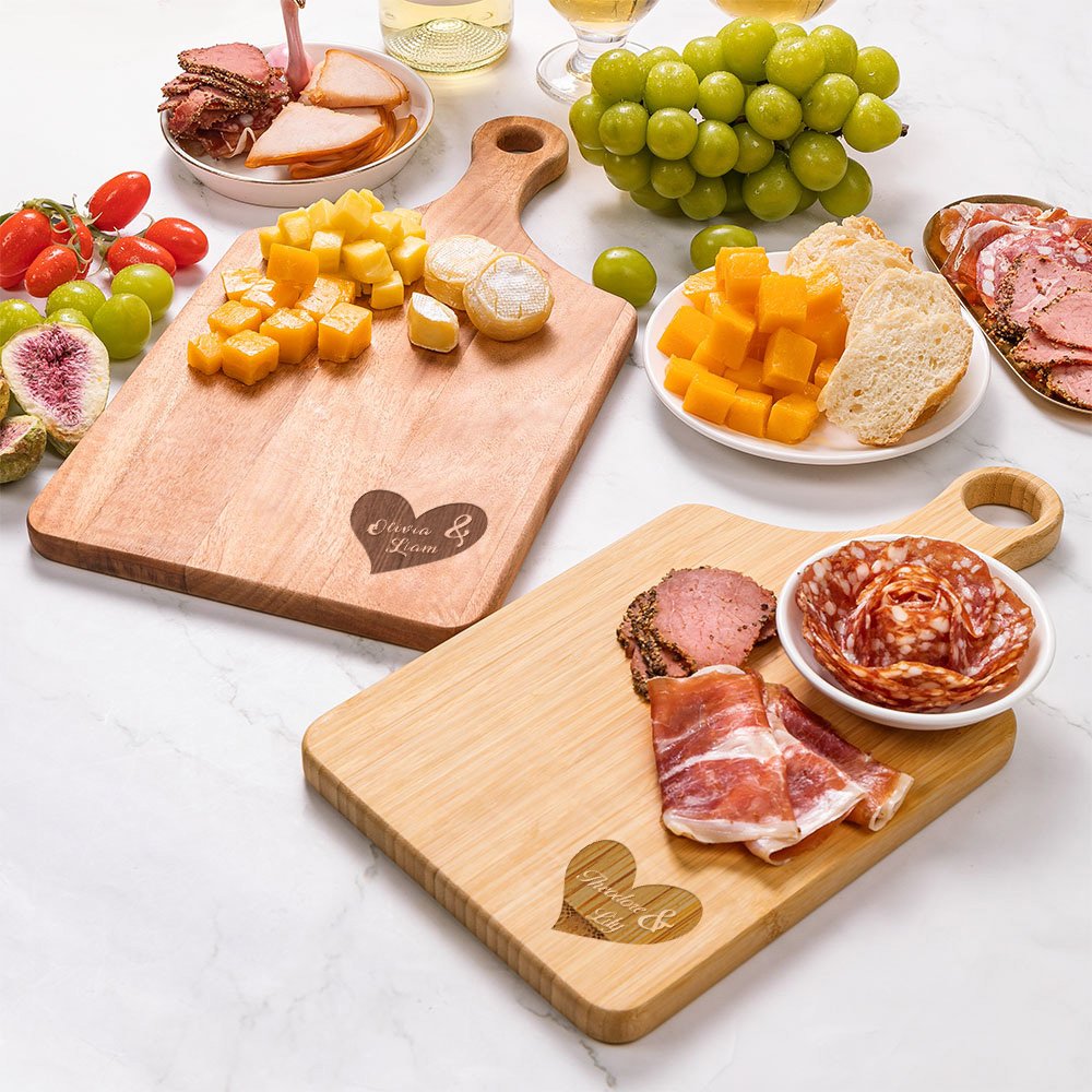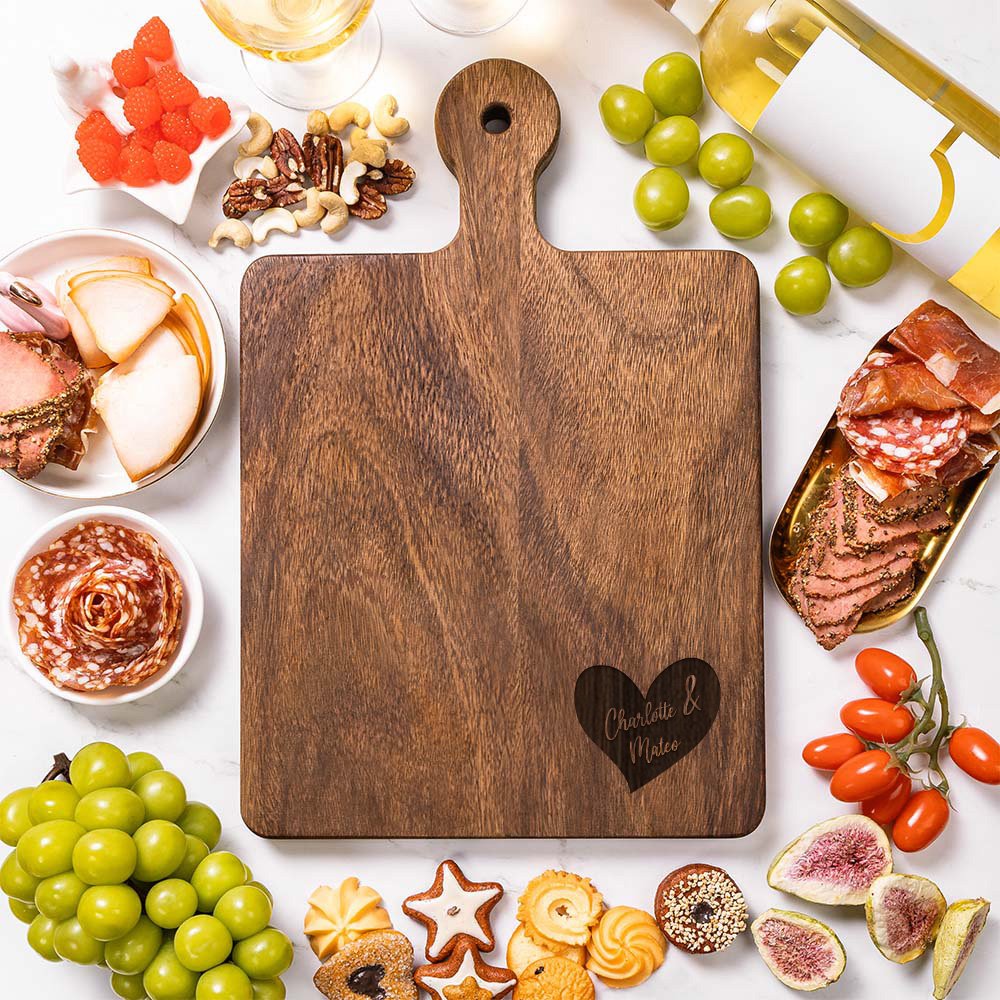 This deli cutting board stands out for its ability to customize the couple's names. Carefully crafted, each piece is unique. The cutting board retains the natural color and grain of the wood. Four different materials and colors of walnut, bamboo, gaboon mahogany (okoume), and cherry wood enrich your choices.