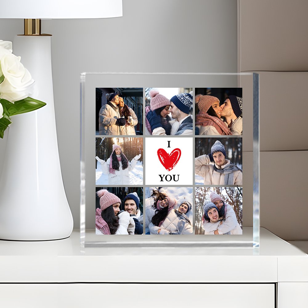 This plaque stands out with its distinctive nine-square design, featuring 8 grids that can be used to display cherished memories between lovers. The words "I LOVE YOU" in the center are presented in a striking red heart pattern, which not only adds a romantic atmosphere but also makes the theme of the entire plaque more prominent. This design is both modern and emotional, perfectly capturing the beautiful moments of love.