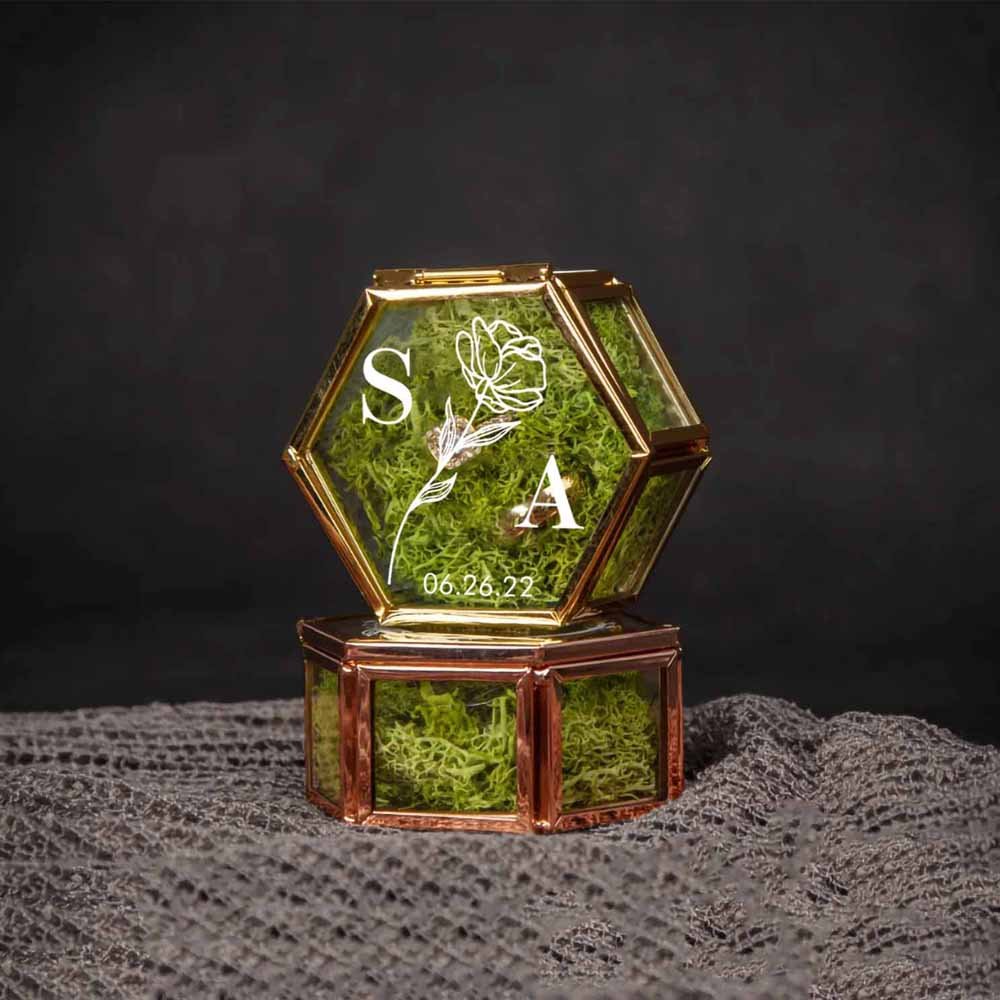 Simple hexagon glass with elegant and sophisticated lines punctuates the superb ring box, adding extra romance and fantasy to the personalized ring holder. There are four styles and two colors for you to choose from, choose one you like to customize. With the names or initials, you can create a wonderful gift for a happy and unforgettable day.
